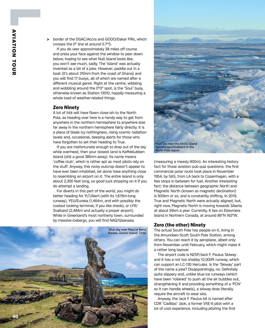 AV I AT I O N T O U R border of the DGAC/Accra and GOOO/Dakar FIRs, which crosses the 0 line at around 0.7S. If you do veer approximately 38 miles off course and press your face against the window to peer down below, hoping to see what Null Island looks like, you wont see much, sadly. The island was actually invented as a bit of a joke. However, paddle out in a boat (its about 310nm from the coast of Ghana) and you will find 17 buoys, all of which are named after a different musical genre. Right at the centre, wibbling and wobbling around the 00 spot, is the Soul buoy, otherwise known as Station 13010, happily measuring a whole load of weather-related things. Zero Ninety A lot of folk will have flown close-ish to the North Pole, as heading over here is a handy way to get from anywhere in the northern hemisphere to anywhere else far away in the northern hemisphere fairly directly. It is a place of bleak icy nothingness, rising cosmic radiation levels and, occasional, beeping alerts for those who have forgotten to set their heading to True. If you are misfortunate enough to drop out of the sky while overhead, then your closest land is Kaffeklubben Island (still a good 385nm away). Its name means coffee club, which is rather apt as most pilots rely on the stuff. Anyway, this rocky outcrop doesnt appear to have ever been inhabited, let alone have anything close to resembling an airport on it. The entire island is only about 2,300 feet long, so good luck stopping on it if you do attempt a landing. For diverts in this part of the world, you might do better heading for YLT/Alert (with its 1,676m-long runway), YEU/Eureka (1,464m, and with possibly the coolest looking terminal, if you like sheds), or LYR/ Svalbard (2,484m and actually a proper airport). While in Greenlands most northerly town, surrounded by massive icebergs, you will find NAQ/Qaanaaq Blue sky over Moai at Rano Raraku, Easter Island, Chile Pack ice near the Arctic island Spitsbergen/Svalbard in the North Pole region (measuring a measly 900m). An interesting history fact for those aviation pub quiz questions: the first commercial polar route took place in November 1954, by SAS, from LA back to Copenhagen, with a few stops in between for fuel. Another interesting fact: the distance between geographic North and Magnetic North (known as magnetic declination) is 500km or so, and is constantly shifting. In 2019, True and Magnetic North were actually aligned, but, right now, Magnetic North is moving towards Siberia at about 55km a year. Currently, it lies on Ellesmere Island in Northern Canada, at around 86N 163W. Zero (the other) Ninety The actual South Pole has people on it, living in the Amundsen-Scott South Pole Station, among others. You can reach it by aeroplane, albeit only from November until February, which might make it a rather long layover. The airport code is NZSP/Jack F. Paulus Skiway and it has a not too shabby 12,000ft runway, which can support an LC-130 Hercules. Is the Skiway part of the name a joke? Disappointingly, no. Definitely quite slippery and, unlike blue ice runways (which have been rollered to push all the air bubbles out, strengthening it and providing something of a PCN so it can handle wheels), a skiway does literally require the aircraft to wear skis. Anyway, the Jack F. Paulus bit is named after CDR Cadillac Jack, a former VXE-6 pilot with a lot of cool experience, including piloting the first 40 THE LOG Win 24 pp39-42 Crossing the seven seas.indd 40 01/12/2023 16:46