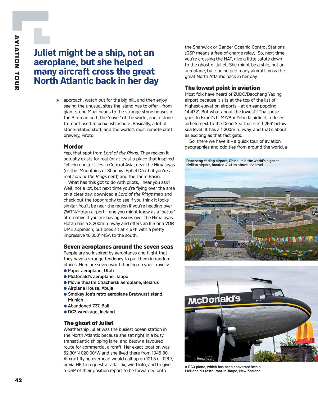AV I AT I O N T O U R Juliet might be a ship, not an aeroplane, but she helped many aircraft cross the great North Atlantic back in her day approach, watch out for the big hill, and then enjoy seeing the unusual sites the island has to offer from giant stone Moai heads to the strange stone houses of the Birdman cult, the navel of the world, and a stone trumpet used to coax fish ashore. Basically, a lot of stone-related stuff, and the worlds most remote craft brewery, Piroto. Mordor Yep, that spot from Lord of the Rings. They reckon it actually exists for real (or at least a place that inspired Tolkein does). It lies in Central Asia, near the Himalayas (or the Mountains of Shadow Ephel Dath if youre a real Lord of the Rings nerd) and the Tarim Basin. What has this got to do with pilots, I hear you ask? Well, not a lot, but next time youre flying over the area on a clear day, download a Lord of the Rings map and check out the topography to see if you think it looks similar. Youll be near the region if youre heading over ZWTN/Hotan airport one you might know as a better alternative if you are having issues over the Himalayas. Hotan has a 3,200m runway and offers an ILS or a VOR DME approach, but does sit at 4,671 with a pretty impressive 16,000 MSA to the south. the Shanwick or Gander Oceanic Control Stations (QSP means a free-of-charge relay). So, next time youre crossing the NAT, give a little salute down to the ghost of Juliet. She might be a ship, not an aeroplane, but she helped many aircraft cross the great North Atlantic back in her day. The lowest point in aviation Most folk have heard of ZUDC/Daocheng Yading airport because it sits at the top of the list of highest-elevation airports at an ear-popping 14,472. But what about the lowest? That prize goes to Israels LLMZ/Bar Yehuda airfield, a desert airfield next to the Dead Sea that sits 1,266 below sea level. It has a 1,200m runway, and thats about as exciting as that fact gets. So, there we have it a quick tour of aviation geographies and oddities from around the world. Daocheng Yading airport, China. It is the worlds highest civilian airport, located 4,411m above sea level Seven aeroplanes around the seven seas People are so inspired by aeroplanes and flight that they have a strange tendency to put them in random places. Here are seven worth finding on your travels: Paper aeroplane, Utah McDonalds aeroplane, Taupo Movie theatre Chachersk aeroplane, Belarus Airplane House, Abuja Smokey Joes retro aeroplane Bratwurst stand, Munich Abandoned 737, Bali DC3 wreckage, Iceland The ghost of Juliet Weathership Juliet was the busiest ocean station in the North Atlantic because she sat right in a busy transatlantic shipping lane, and below a favoured route for commercial aircraft. Her exact location was 52.30N 020.00W and she lived there from 1945-80. Aircraft flying overhead would call up on 121.5 or 126.7, or via HF, to request a radar fix, wind info, and to give a QSP of their position report to be forwarded onto A DC3 plane, which has been converted into a McDonalds restaurant in Taupo, New Zealand 42 THE LOG Win 24 pp39-42 Crossing the seven seas.indd 42 01/12/2023 16:47