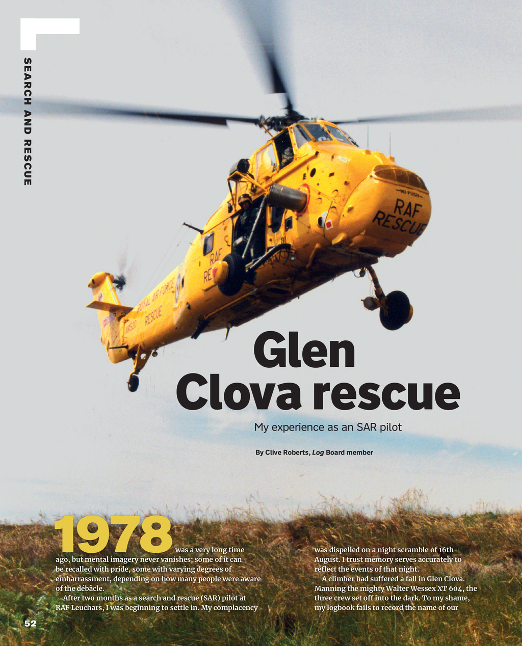 S E A R C H A N D R E SC U E Glen Clova rescue My experience as an SAR pilot By Clive Roberts, Log Board member was a very long time ago, but mental imagery never vanishes; some of it can be recalled with pride, some with varying degrees of embarrassment, depending on how many people were aware of the dbcle. After two months as a search and rescue (SAR) pilot at RAF Leuchars, I was beginning to settle in. My complacency was dispelled on a night scramble of 16th August. I trust memory serves accurately to reflect the events of that night. A climber had suffered a fall in Glen Clova. Manning the mighty Walter Wessex XT 604, the three crew set off into the dark. To my shame, my logbook fails to record the name of our 52 THE LOG Win 24 pp52-53 Glen Clova.indd 52 01/12/2023 14:59
