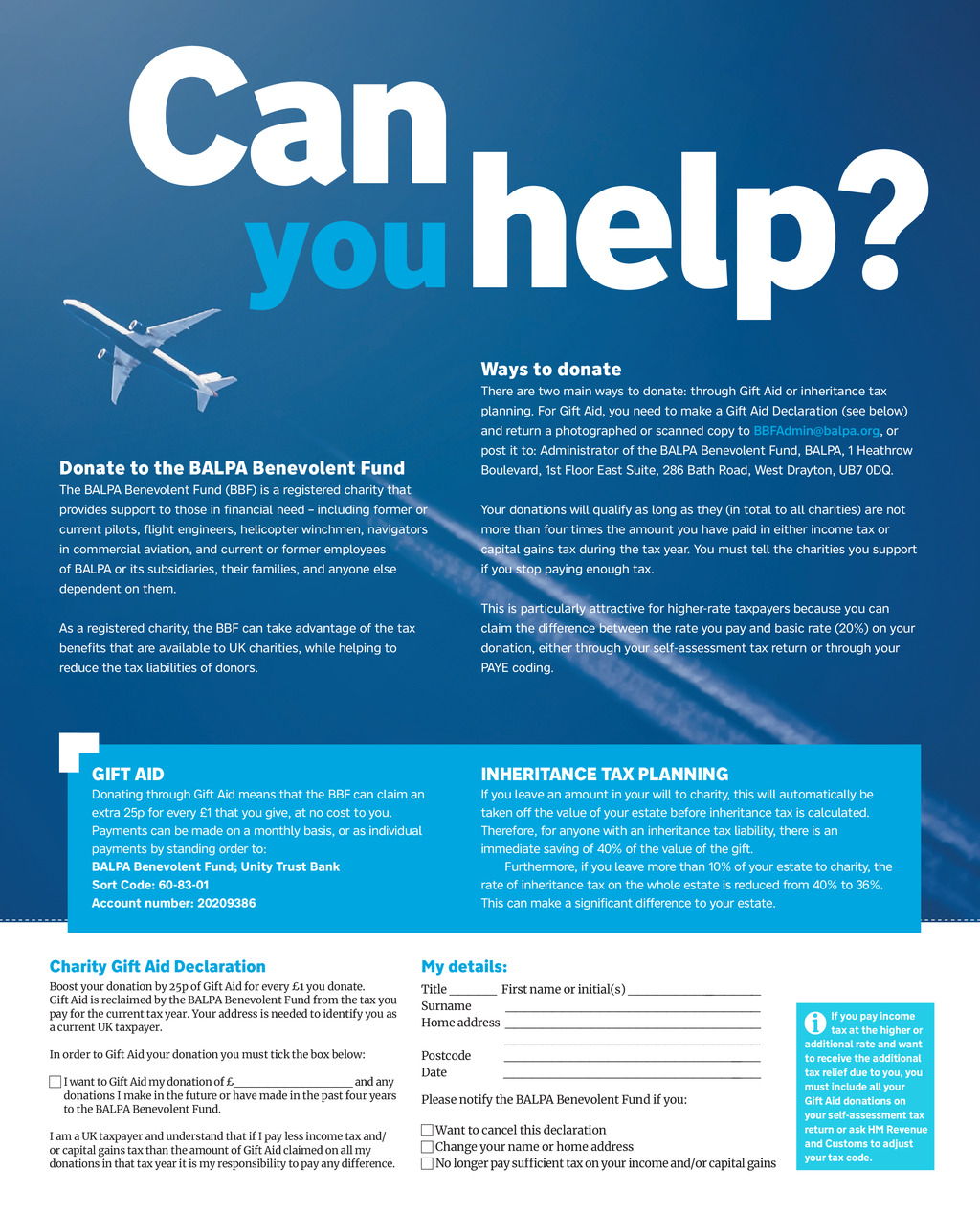 Can you help? Ways to donate There are two main ways to donate: through Gift Aid or inheritance tax planning. For Gift Aid, you need to make a Gift Aid Declaration (see below) and return a photographed or scanned copy to BBFAdmin@balpa.org, or post it to: Administrator of the BALPA Benevolent Fund, BALPA, 1 Heathrow Donate to the BALPA Benevolent Fund Boulevard, 1st Floor East Suite, 286 Bath Road, West Drayton, UB7 0DQ. The BALPA Benevolent Fund (BBF) is a registered charity that provides support to those in financial need including former or Your donations will qualify as long as they (in total to all charities) are not current pilots, flight engineers, helicopter winchmen, navigators more than four times the amount you have paid in either income tax or in commercial aviation, and current or former employees capital gains tax during the tax year. You must tell the charities you support of BALPA or its subsidiaries, their families, and anyone else if you stop paying enough tax. dependent on them. This is particularly attractive for higher-rate taxpayers because you can As a registered charity, the BBF can take advantage of the tax claim the difference between the rate you pay and basic rate (20%) on your benefits that are available to UK charities, while helping to donation, either through your self-assessment tax return or through your reduce the tax liabilities of donors. PAYE coding. GIFT AID Donating through Gift Aid means that the BBF can claim an extra 25p for every 1 that you give, at no cost to you. Payments can be made on a monthly basis, or as individual payments by standing order to: BALPA Benevolent Fund; Unity Trust Bank Sort Code: 60-83-01 Account number: 20209386 INHERITANCE TAX PLANNING If you leave an amount in your will to charity, this will automatically be taken off the value of your estate before inheritance tax is calculated. Therefore, for anyone with an inheritance tax liability, there is an immediate saving of 40% of the value of the gift. Furthermore, if you leave more than 10% of your estate to charity, the rate of inheritance tax on the whole estate is reduced from 40% to 36%. This can make a significant difference to your estate. Charity Gift Aid Declaration My details: Boost your donation by 25p of Gift Aid for every 1 you donate. Gift Aid is reclaimed by the BALPA Benevolent Fund from the tax you pay for the current tax year. Your address is needed to identify you as a current UK taxpayer. Title _____ First name or initial(s) _________ ______ Surname ___________________________ Home address ___________________________ ___________________________ Postcode _________________________ ___ Date _________________________ ___ In order to Gift Aid your donation you must tick the box below: I want to Gift Aid my donation of ______________ and any donations I make in the future or have made in the past four years to the BALPA Benevolent Fund. I am a UK taxpayer and understand that if I pay less income tax and/ or capital gains tax than the amount of Gift Aid claimed on all my donations in that tax year it is my responsibility to pay any difference. THE LOG Win 24 pp56 BALPA BBF AD.indd 56 Please notify the BALPA Benevolent Fund if you: Want to cancel this declaration Change your name or home address N o longer pay sufficient tax on your income and/or capital gains If you pay income tax at the higher or additional rate and want to receive the additional tax relief due to you, you must include all your Gift Aid donations on your self-assessment tax return or ask HM Revenue and Customs to adjust your tax code. 01/12/2023 15:00