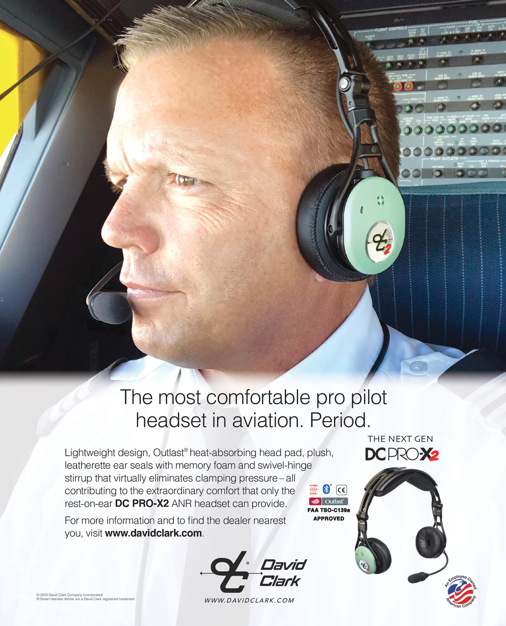 The most comfortable pro pilot headset in aviation. Period. Lightweight design, Outlast heat-absorbing head pad, plush, leatherette ear seals with memory foam and swivel-hinge stirrup that virtually eliminates clamping pressure all contributing to the extraordinary comfort that only the rest-on-ear DC PRO-X2 ANR headset can provide. FAA TSO-C139a THE NEXT GEN HYBRID For more information and to find the dealer nearest you, visit www.davidclark.com. 2023 David Clark Company Incorporated Green headset domes are a David Clark registered trademark. 230-37370REV PRO-X2 Comf 210X260mmBALPA.indd 1 THE LOG Win 24 pp58-60 Dash trash.indd 60 APPROVED W W W. D A V I D C L A R K . C O M 11/27/23 AM 01/12/20239:47 15:01