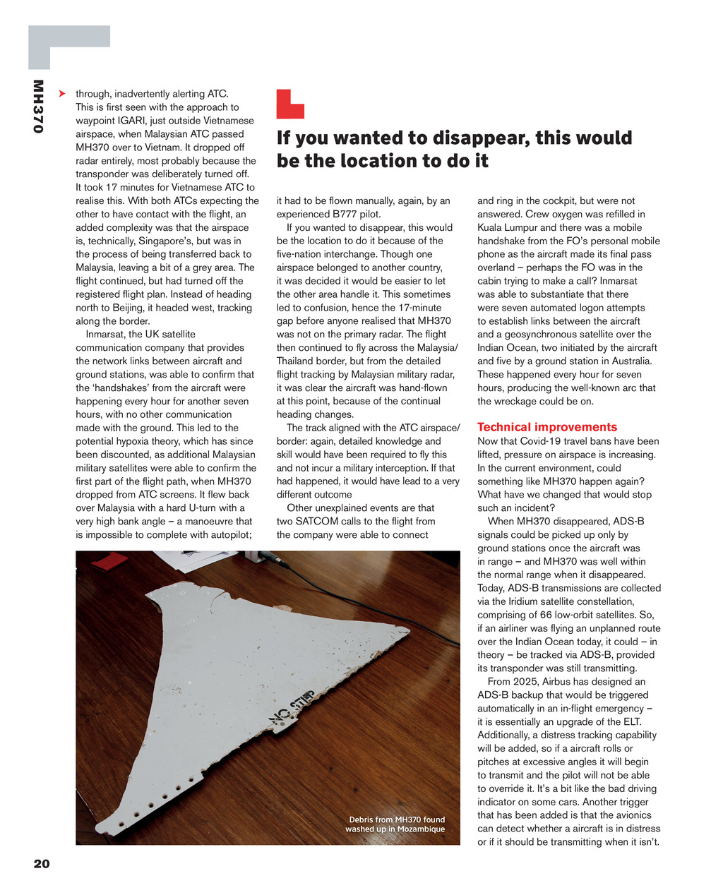 M H 370 through, inadvertently alerting ATC. This is first seen with the approach to waypoint IGARI, just outside Vietnamese airspace, when Malaysian ATC passed MH370 over to Vietnam. It dropped off radar entirely, most probably because the transponder was deliberately turned off. It took 17 minutes for Vietnamese ATC to realise this. With both ATCs expecting the other to have contact with the flight, an added complexity was that the airspace is, technically, Singapores, but was in the process of being transferred back to Malaysia, leaving a bit of a grey area. The flight continued, but had turned off the registered flight plan. Instead of heading north to Beijing, it headed west, tracking along the border. Inmarsat, the UK satellite communication company that provides the network links between aircraft and ground stations, was able to confirm that the handshakes from the aircraft were happening every hour for another seven hours, with no other communication made with the ground. This led to the potential hypoxia theory, which has since been discounted, as additional Malaysian military satellites were able to confirm the first part of the flight path, when MH370 dropped from ATC screens. It flew back over Malaysia with a hard U-turn with a very high bank angle a manoeuvre that is impossible to complete with autopilot; If you wanted to disappear, this would be the location to do it it had to be flown manually, again, by an experienced B777 pilot. If you wanted to disappear, this would be the location to do it because of the five-nation interchange. Though one airspace belonged to another country, it was decided it would be easier to let the other area handle it. This sometimes led to confusion, hence the 17-minute gap before anyone realised that MH370 was not on the primary radar. The flight then continued to fly across the Malaysia/ Thailand border, but from the detailed flight tracking by Malaysian military radar, it was clear the aircraft was hand-flown at this point, because of the continual heading changes. The track aligned with the ATC airspace/ border: again, detailed knowledge and skill would have been required to fly this and not incur a military interception. If that had happened, it would have lead to a very different outcome Other unexplained events are that two SATCOM calls to the flight from the company were able to connect Debris from MH370 found washed up in Mozambique and ring in the cockpit, but were not answered. Crew oxygen was refilled in Kuala Lumpur and there was a mobile handshake from the FOs personal mobile phone as the aircraft made its final pass overland perhaps the FO was in the cabin trying to make a call? Inmarsat was able to substantiate that there were seven automated logon attempts to establish links between the aircraft and a geosynchronous satellite over the Indian Ocean, two initiated by the aircraft and five by a ground station in Australia. These happened every hour for seven hours, producing the well-known arc that the wreckage could be on. Technical improvements Now that Covid-19 travel bans have been lifted, pressure on airspace is increasing. In the current environment, could something like MH370 happen again? What have we changed that would stop such an incident? When MH370 disappeared, ADS-B signals could be picked up only by ground stations once the aircraft was in range and MH370 was well within the normal range when it disappeared. Today, ADS-B transmissions are collected via the Iridium satellite constellation, comprising of 66 low-orbit satellites. So, if an airliner was flying an unplanned route over the Indian Ocean today, it could in theory be tracked via ADS-B, provided its transponder was still transmitting. From 2025, Airbus has designed an ADS-B backup that would be triggered automatically in an in-flight emergency it is essentially an upgrade of the ELT. Additionally, a distress tracking capability will be added, so if a aircraft rolls or pitches at excessive angles it will begin to transmit and the pilot will not be able to override it. Its a bit like the bad driving indicator on some cars. Another trigger that has been added is that the avionics can detect whether a aircraft is in distress or if it should be transmitting when it isnt. 20 THE LOG Spring 25 pp18-21 MH370.indd 20 17/03/2025 14:16
