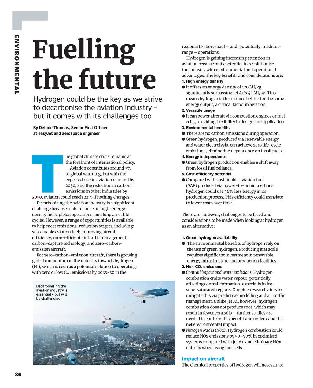E N V I R O N M E N TA L Fuelling the future Hydrogen could be the key as we strive to decarbonise the aviation industry but it comes with its challenges too By Debbie Thomas, Senior First Officer at easyJet and aerospace engineer T he global climate crisis remains at the forefront of international policy. Aviation contributes around 3% to global warming, but with the expected rise in aviation demand by 2050, and the reduction in carbon emissions in other industries by 2050, aviation could reach 22% if nothing changes. Decarbonising the aviation industry is a significant challenge because of its reliance on high-energydensity fuels, global operations, and long asset lifecycles. However, a range of opportunities is available to help meet emissions-reduction targets, including: sustainable aviation fuel; improving aircraft efficiency; more efficient air traffic management; carbon-capture technology; and zero-carbonemission aircraft. For zero-carbon-emission aircraft, there is growing global momentum in the industry towards hydrogen (H2), which is seen as a potential solution to operating with zero or low CO2 emissions by 2035-50 in the Decarbonising the aviation industry is essential but will be challenging regional to short-haul and, potentially, mediumrange operations. Hydrogen is gaining increasing attention in aviation because of its potential to revolutionise the industry with environmental and operational advantages. The key benefits and considerations are: 1. High energy density I t offers an energy density of 120 MJ/kg, significantly surpassing Jet A1s 43 MJ/kg. This means hydrogen is three times lighter for the same energy output, a critical factor in aviation. 2. Versatile usage I t can power aircraft via combustion engines or fuel cells, providing flexibility in design and application. 3. Environmental benefits T here are no carbon emissions during operation. G reen hydrogen, produced via renewable energy and water electrolysis, can achieve zero life-cycle emissions, eliminating dependence on fossil fuels. 4. Energy independence G reen hydrogen production enables a shift away from fossil fuel reliance. 5. Cost-efficiency potential C ompared with sustainable aviation fuel (SAF) produced via power-to-liquid methods, hydrogen could use 36% less energy in its production process. This efficiency could translate to lower costs over time. There are, however, challenges to be faced and considerations to be made when looking at hydrogen as an alternative: 1. Green hydrogen availability The environmental benefits of hydrogen rely on the use of green hydrogen. Producing it at scale requires significant investment in renewable energy infrastructure and production facilities. 2. Non-CO2 emissions C ontrail impact and water emissions: Hydrogen combustion emits water vapour, potentially affecting contrail formation, especially in icesupersaturated regions. Ongoing research aims to mitigate this via predictive modelling and air traffic management. Unlike Jet A1, however, hydrogen combustion does not produce soot, which may result in fewer contrails further studies are needed to confirm this benefit and understand the net environmental impact. N itrogen oxides (NOx): Hydrogen combustion could reduce NOx emissions by 5070% in optimised systems compared with Jet A1, and eliminate NOx entirely when using fuel cells. Impact on aircraft The chemical properties of hydrogen will necessitate 36 THE LOG Spring 25 pp36-37 Sustainability.indd 36 17/03/2025 14:22