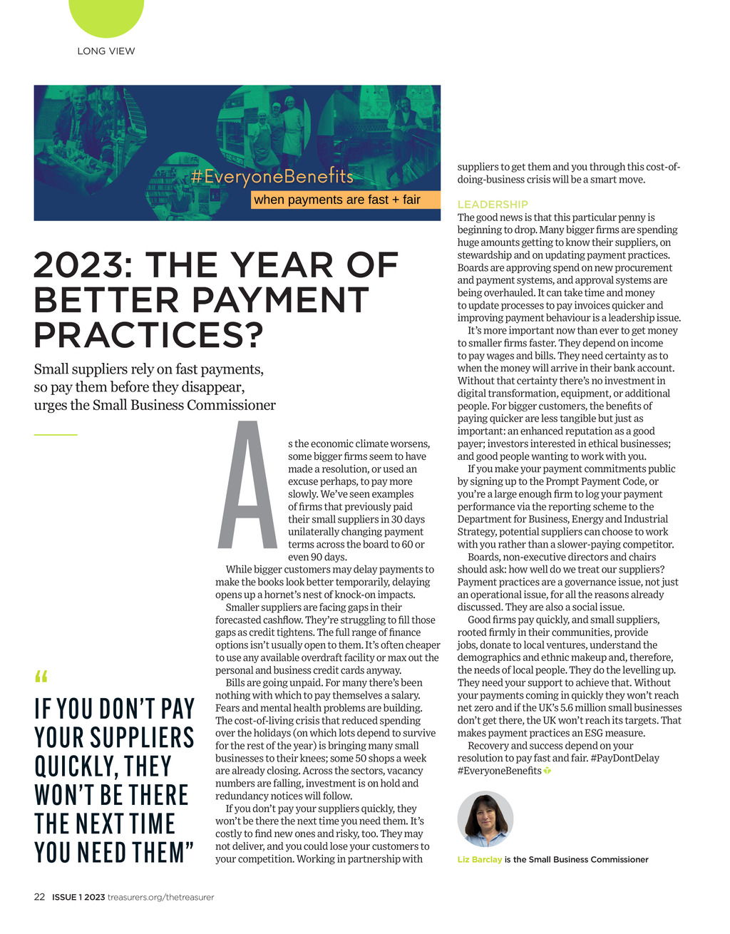 LONG VIEW suppliers to get them and you through this cost-ofdoing-business crisis will be a smart move. LEADERSHIP 2023: THE YEAR OF BETTER PAYMENT PRACTICES? Small suppliers rely on fast payments, so pay them before they disappear, urges the Small Business Commissioner A IF YOU DONT PAY YOUR SUPPLIERS QUICKLY, THEY WONT BE THERE THE NEXT TIME YOU NEED THEM s the economic climate worsens, some bigger firms seem to have made a resolution, or used an excuse perhaps, to pay more slowly. Weve seen examples of firms that previously paid their small suppliers in 30 days unilaterally changing payment terms across the board to 60 or even 90 days. While bigger customers may delay payments to make the books look better temporarily, delaying opens up a hornets nest of knock-on impacts. Smaller suppliers are facing gaps in their forecasted cashflow. Theyre struggling to fill those gaps as credit tightens. The full range of finance options isnt usually open to them. Its often cheaper to use any available overdraft facility or max out the personal and business credit cards anyway. Bills are going unpaid. For many theres been nothing with which to pay themselves a salary. Fears and mental health problems are building. The cost-of-living crisis that reduced spending over the holidays (on which lots depend to survive for the rest of the year) is bringing many small businesses to their knees; some 50 shops a week are already closing. Across the sectors, vacancy numbers are falling, investment is on hold and redundancy notices will follow. If you dont pay your suppliers quickly, they wont be there the next time you need them. Its costly to find new ones and risky, too. They may not deliver, and you could lose your customers to your competition. Working in partnership with The good news is that this particular penny is beginning to drop. Many bigger firms are spending huge amounts getting to know their suppliers, on stewardship and on updating payment practices. Boards are approving spend on new procurement and payment systems, and approval systems are being overhauled. It can take time and money to update processes to pay invoices quicker and improving payment behaviour is a leadership issue. Its more important now than ever to get money to smaller firms faster. They depend on income to pay wages and bills. They need certainty as to when the money will arrive in their bank account. Without that certainty theres no investment in digital transformation, equipment, or additional people. For bigger customers, the benefits of paying quicker are less tangible but just as important: an enhanced reputation as a good payer; investors interested in ethical businesses; and good people wanting to work with you. If you make your payment commitments public by signing up to the Prompt Payment Code, or youre a large enough firm to log your payment performance via the reporting scheme to the Department for Business, Energy and Industrial Strategy, potential suppliers can choose to work with you rather than a slower-paying competitor. Boards, non-executive directors and chairs should ask: how well do we treat our suppliers? Payment practices are a governance issue, not just an operational issue, for all the reasons already discussed. They are also a social issue. Good firms pay quickly, and small suppliers, rooted firmly in their communities, provide jobs, donate to local ventures, understand the demographics and ethnic makeup and, therefore, the needs of local people. They do the levelling up. They need your support to achieve that. Without your payments coming in quickly they wont reach net zero and if the UKs 5.6 million small businesses dont get there, the UK wont reach its targets. That makes payment practices an ESG measure. Recovery and success depend on your resolution to pay fast and fair. #PayDontDelay #EveryoneBenefits Liz Barclay is the Small Business Commissioner 22 ISSUE 1 2023 treasurers.org/thetreasurer TT ISSUE 1 23 pp22 Comment.indd 22 23/02/2023 09:12