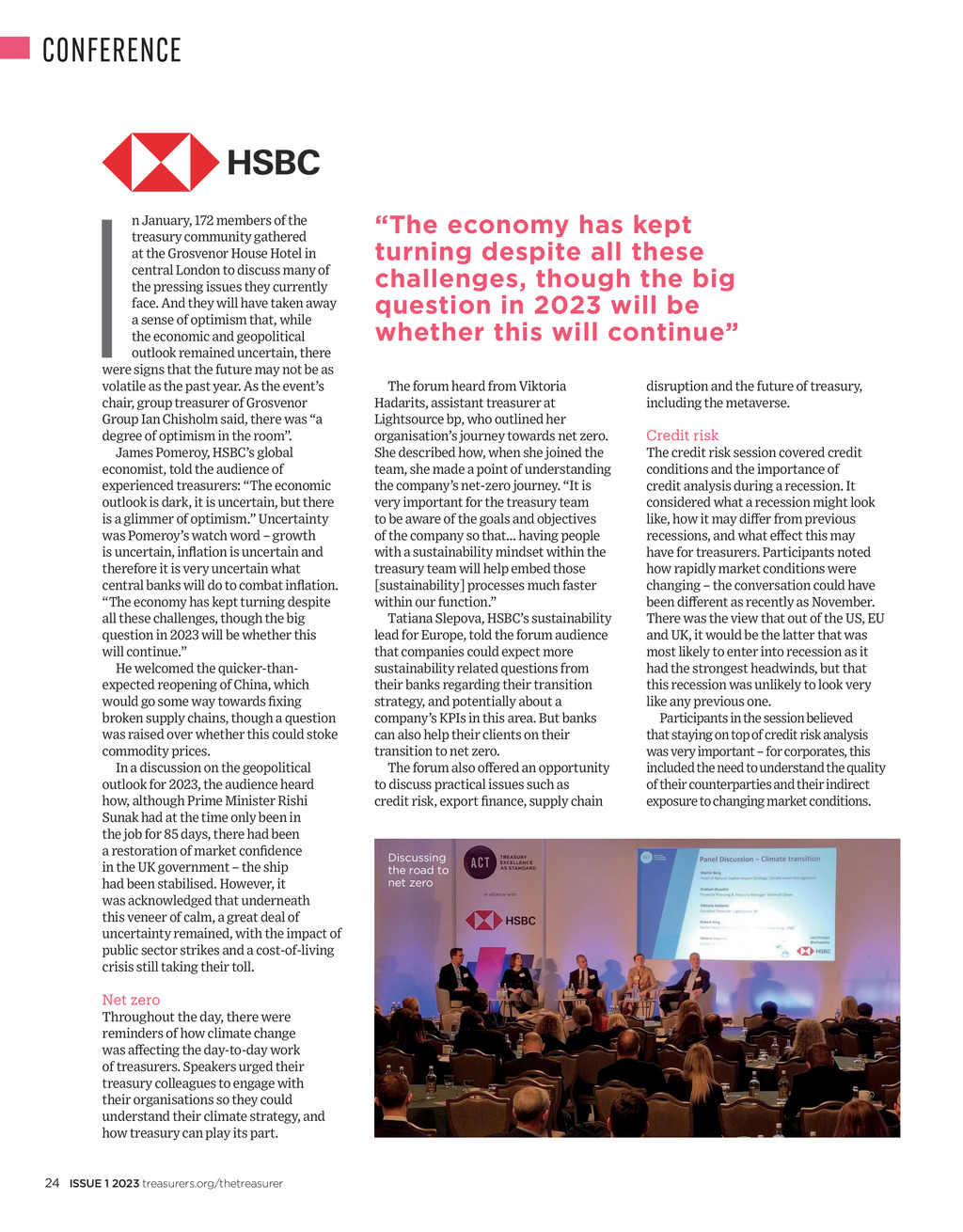 CONFERENCE I n January, 172 members of the treasury community gathered at the Grosvenor House Hotel in central London to discuss many of the pressing issues they currently face. And they will have taken away a sense of optimism that, while the economic and geopolitical outlook remained uncertain, there were signs that the future may not be as volatile as the past year. As the events chair, group treasurer of Grosvenor Group Ian Chisholm said, there was a degree of optimism in the room. James Pomeroy, HSBCs global economist, told the audience of experienced treasurers: The economic outlook is dark, it is uncertain, but there is a glimmer of optimism. Uncertainty was Pomeroys watch word growth is uncertain, inflation is uncertain and therefore it is very uncertain what central banks will do to combat inflation. The economy has kept turning despite all these challenges, though the big question in 2023 will be whether this will continue. He welcomed the quicker-thanexpected reopening of China, which would go some way towards fixing broken supply chains, though a question was raised over whether this could stoke commodity prices. In a discussion on the geopolitical outlook for 2023, the audience heard how, although Prime Minister Rishi Sunak had at the time only been in the job for 85 days, there had been a restoration of market confidence in the UK government the ship had been stabilised. However, it was acknowledged that underneath this veneer of calm, a great deal of uncertainty remained, with the impact of public sector strikes and a cost-of-living crisis still taking their toll. The economy has kept turning despite all these challenges, though the big question in 2023 will be whether this will continue The forum heard from Viktoria Hadarits, assistant treasurer at Lightsource bp, who outlined her organisations journey towards net zero. She described how, when she joined the team, she made a point of understanding the companys net-zero journey. It is very important for the treasury team to be aware of the goals and objectives of the company so that having people with a sustainability mindset within the treasury team will help embed those [sustainability] processes much faster within our function. Tatiana Slepova, HSBCs sustainability lead for Europe, told the forum audience that companies could expect more sustainability related questions from their banks regarding their transition strategy, and potentially about a companys KPIs in this area. But banks can also help their clients on their transition to net zero. The forum also offered an opportunity to discuss practical issues such as credit risk, export finance, supply chain disruption and the future of treasury, including the metaverse. Credit risk The credit risk session covered credit conditions and the importance of credit analysis during a recession. It considered what a recession might look like, how it may differ from previous recessions, and what effect this may have for treasurers. Participants noted how rapidly market conditions were changing the conversation could have been different as recently as November. There was the view that out of the US, EU and UK, it would be the latter that was most likely to enter into recession as it had the strongest headwinds, but that this recession was unlikely to look very like any previous one. Participants in the session believed that staying on top of credit risk analysis was very important for corporates, this included the need to understand the quality of their counterparties and their indirect exposure to changing market conditions. Discussing the road to net zero Net zero Throughout the day, there were reminders of how climate change was affecting the day-to-day work of treasurers. Speakers urged their treasury colleagues to engage with their organisations so they could understand their climate strategy, and how treasury can play its part. 24 ISSUE 1 2023 treasurers.org/thetreasurer TT ISSUE 1 23 pp23-25 Forum.indd 24 23/02/2023 13:20
