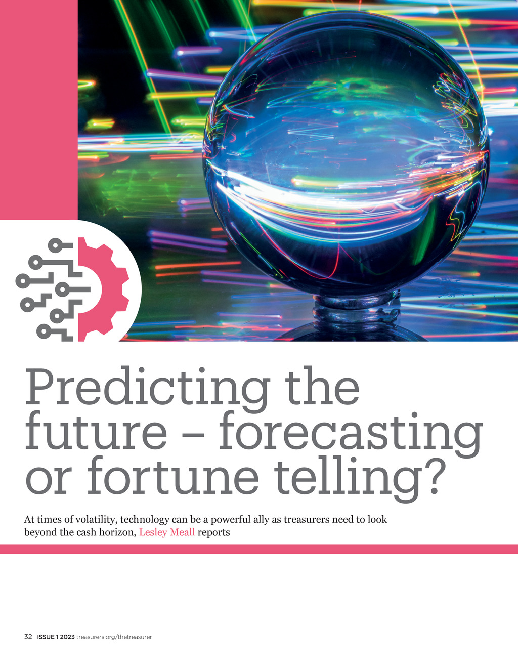 Predicting the future forecasting or fortune telling? At times of volatility, technology can be a powerful ally as treasurers need to look beyond the cash horizon, Lesley Meall reports 32 ISSUE 1 2023 treasurers.org/thetreasurer TT ISSUE 1 23 pp32-34 Tech Focus.indd 32 23/02/2023 09:20