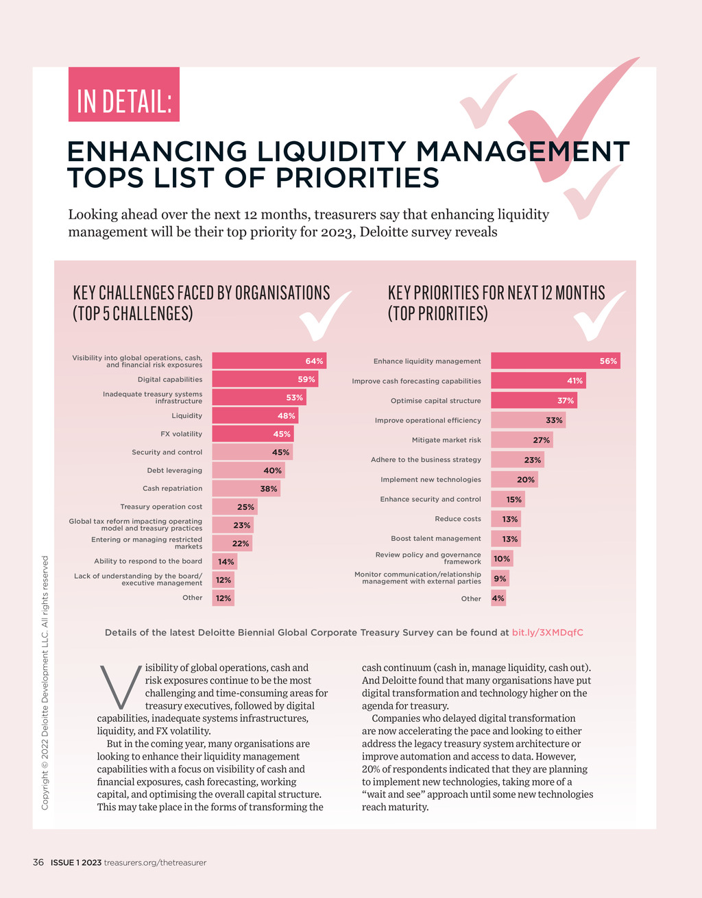 IN DETAIL: ENHANCING LIQUIDITY MANAGEMENT TOPS LIST OF PRIORITIES Looking ahead over the next 12 months, treasurers say that enhancing liquidity management will be their top priority for 2023, Deloitte survey reveals KEY CHALLENGES FACED BY ORGANISATIONS (TOP 5 CHALLENGES) Visibility into global operations, cash, and financial risk exposures 64% 59% Digital capabilities Inadequate treasury systems infrastructure 53% 48% Liquidity FX volatility 45% Security and control 45% 40% Debt leveraging 38% Cash repatriation 25% Copyright 2022 Deloitte Development LLC. All rights reserved Treasury operation cost Global tax reform impacting operating model and treasury practices 23% Entering or managing restricted markets 22% Ability to respond to the board 14% KEY PRIORITIES FOR NEXT 12 MONTHS (TOP PRIORITIES) 56% Enhance liquidity management 41% Improve cash forecasting capabilities 37% Optimise capital structure 33% Improve operational efficiency 27% Mitigate market risk 23% Adhere to the business strategy 20% Implement new technologies 15% Enhance security and control Reduce costs 13% Boost talent management 13% Review policy and governance framework 10% Lack of understanding by the board/ executive management 12% Monitor communication/relationship management with external parties 9% Other 12% Other 4% Details of the latest Deloitte Biennial Global Corporate Treasury Survey can be found at bit.ly/3XMDqfC V isibility of global operations, cash and risk exposures continue to be the most challenging and time-consuming areas for treasury executives, followed by digital capabilities, inadequate systems infrastructures, liquidity, and FX volatility. But in the coming year, many organisations are looking to enhance their liquidity management capabilities with a focus on visibility of cash and financial exposures, cash forecasting, working capital, and optimising the overall capital structure. This may take place in the forms of transforming the cash continuum (cash in, manage liquidity, cash out). And Deloitte found that many organisations have put digital transformation and technology higher on the agenda for treasury. Companies who delayed digital transformation are now accelerating the pace and looking to either address the legacy treasury system architecture or improve automation and access to data. However, 20% of respondents indicated that they are planning to implement new technologies, taking more of a wait and see approach until some new technologies reach maturity. 36 ISSUE 1 2023 treasurers.org/thetreasurer TT ISSUE 1 23 pp36 infographic.indd 36 23/02/2023 09:42