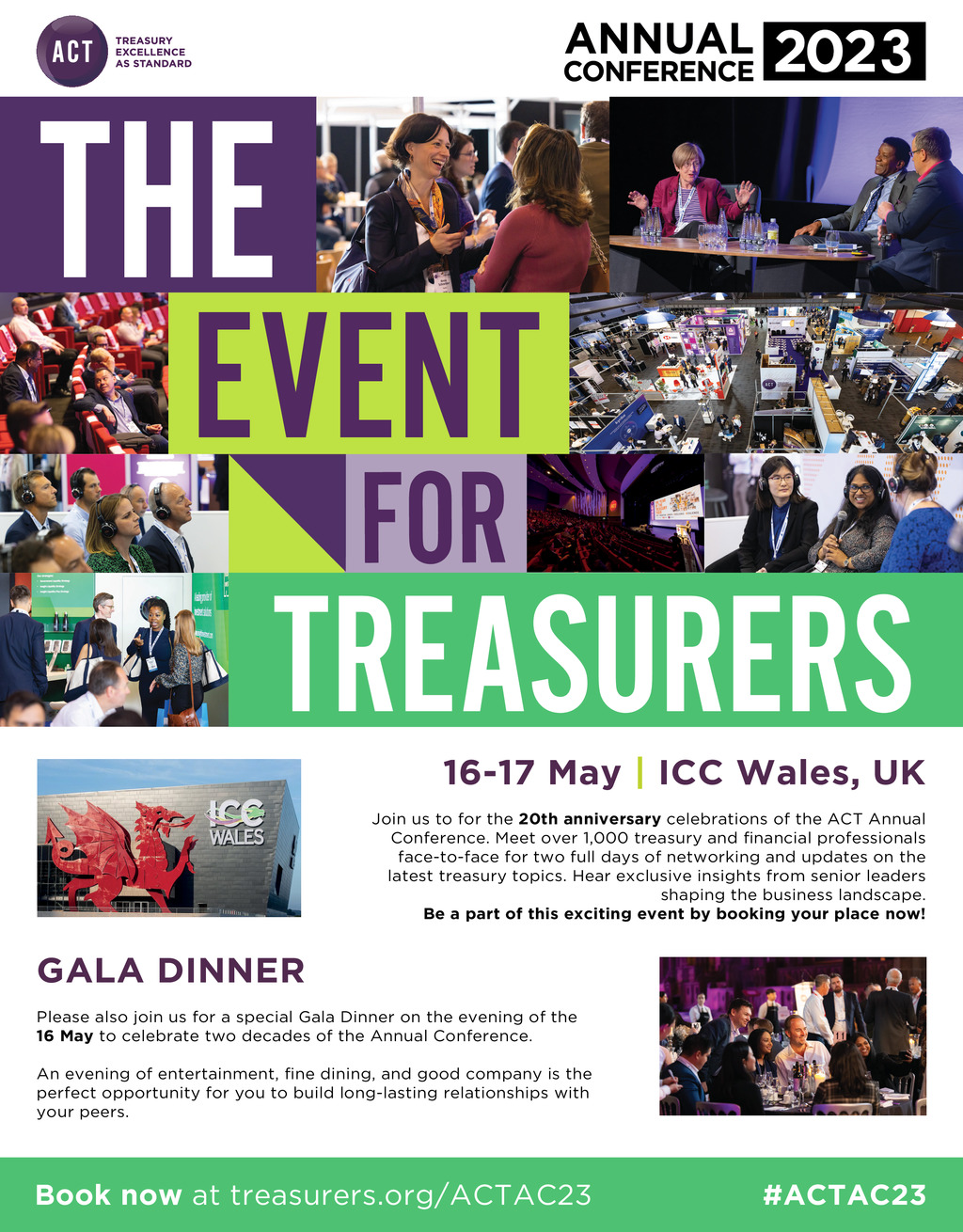 THE EVENT FOR psum TREASURERS 16-17 May | ICC Wales, UK Join us to for the 20th anniversary celebrations of the ACT Annual Conference. Meet over 1,000 treasury and financial professionals face-to-face for two full days of networking and updates on the latest treasury topics. Hear exclusive insights from senior leaders shaping the business landscape. Be a part of this exciting event by booking your place now! GALA DINNER Please also join us for a special Gala Dinner on the evening of the 16 May to celebrate two decades of the Annual Conference. An evening of entertainment, fine dining, and good company is the perfect opportunity for you to build long-lasting relationships with your peers. Book now at treasurers.org/ACTAC23 TT ISSUE 1 23 pp4-5 Contents.indd 4 #ACTAC23 23/02/2023 08:57