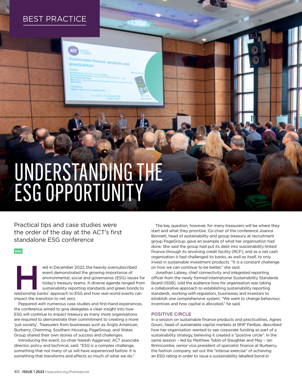 BEST PRACTICE UNDERSTANDING THE ESG OPPORTUNITY Practical tips and case studies were the order of the day at the ACTs first standalone ESG conference ESG H eld in December 2022, the heavily oversubscribed event demonstrated the growing importance of environmental, social and governance (ESG) issues for todays treasury teams. A diverse agenda ranged from sustainability reporting standards and green bonds to relationship banks approach to ESG and how real-world events can impact the transition to net zero. Peppered with numerous case studies and first-hand experiences, the conference aimed to give delegates a clear insight into how ESG will continue to impact treasury as many more organisations are required to demonstrate their commitment to creating a more just society. Treasurers from businesses such as Anglo American, Burberry, Chemring, Southern Housing, PageGroup, and Wates Group shared their own stories of success and challenges. Introducing the event, co-chair Naresh Aggarwal, ACT associate director, policy and technical, said: ESG is a complex challenge, something that not many of us will have experienced before. It is something that transforms and affects so much of what we do. The key question, however, for many treasurers will be where they start and what they prioritise. Co-chair of the conference Joanna Bonnett, head of sustainability and group treasury at recruitment group PageGroup, gave an example of what her organisation had done. She said the group had put its debt into sustainability-linked finance through its revolving credit facility (RCF), and as a net cash organisation it had challenged its banks, as well as itself, to only invest in sustainable investment products. It is a constant challenge on how we can continue to be better, she said. Jonathan Labrey, chief connectivity and integrated reporting officer from the newly formed International Sustainability Standards Board (ISSB), told the audience how his organisation was taking a collaborative approach to establishing sustainability reporting standards, working with regulators, businesses and investors to establish one comprehensive system. We want to change behaviour, incentives and how capital is allocated, he said. POSITIVE CIRCLE In a session on sustainable finance products and practicalities, Agnes Gourc, head of sustainable capital markets at BNP Paribas, described how her organisation wanted to see corporate funding as part of a sustainability strategy, believing it created a positive circle. In the same session led by Matthew Tobin of Slaughter and May Ian Brimicombe, senior vice president of specialist finance at Burberry, the fashion company, set out the intense exercise of achieving an ESG rating in order to issue a sustainability labelled bond in 40 ISSUE 1 2023 treasurers.org/thetreasurer TT ISSUE 1 23 pp40-41 ESG conf.indd 40 23/02/2023 13:22