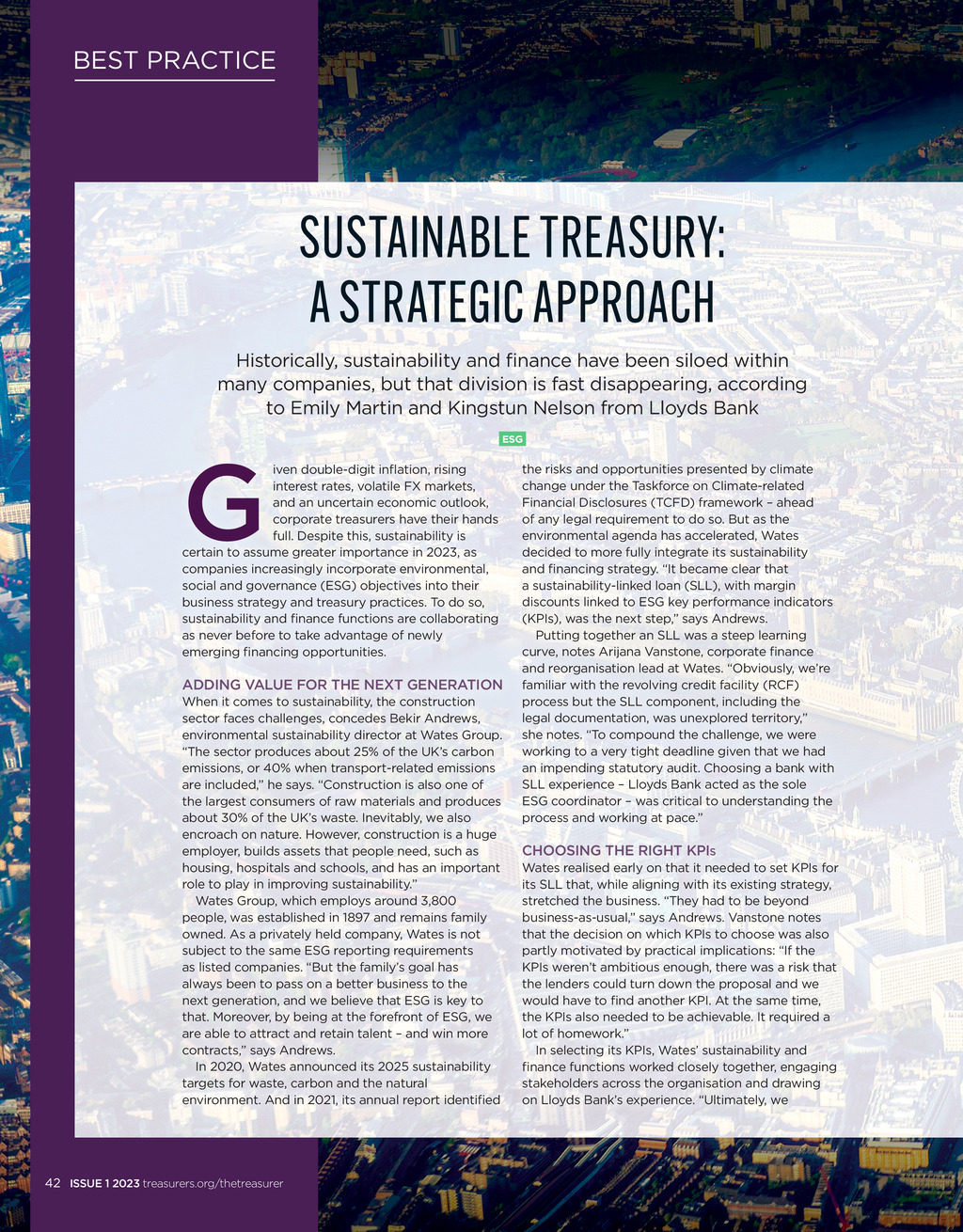 BEST PRACTICE SUSTAINABLE TREASURY: A STRATEGIC APPROACH Historically, sustainability and finance have been siloed within many companies, but that division is fast disappearing, according to Emily Martin and Kingstun Nelson from Lloyds Bank G ESG iven double-digit inflation, rising interest rates, volatile FX markets, and an uncertain economic outlook, corporate treasurers have their hands full. Despite this, sustainability is certain to assume greater importance in 2023, as companies increasingly incorporate environmental, social and governance (ESG) objectives into their business strategy and treasury practices. To do so, sustainability and finance functions are collaborating as never before to take advantage of newly emerging financing opportunities. ADDING VALUE FOR THE NEXT GENERATION When it comes to sustainability, the construction sector faces challenges, concedes Bekir Andrews, environmental sustainability director at Wates Group. The sector produces about 25% of the UKs carbon emissions, or 40% when transport-related emissions are included, he says. Construction is also one of the largest consumers of raw materials and produces about 30% of the UKs waste. Inevitably, we also encroach on nature. However, construction is a huge employer, builds assets that people need, such as housing, hospitals and schools, and has an important role to play in improving sustainability. Wates Group, which employs around 3,800 people, was established in 1897 and remains family owned. As a privately held company, Wates is not subject to the same ESG reporting requirements as listed companies. But the familys goal has always been to pass on a better business to the next generation, and we believe that ESG is key to that. Moreover, by being at the forefront of ESG, we are able to attract and retain talent and win more contracts, says Andrews. In 2020, Wates announced its 2025 sustainability targets for waste, carbon and the natural environment. And in 2021, its annual report identified the risks and opportunities presented by climate change under the Taskforce on Climate-related Financial Disclosures (TCFD) framework ahead of any legal requirement to do so. But as the environmental agenda has accelerated, Wates decided to more fully integrate its sustainability and financing strategy. It became clear that a sustainability-linked loan (SLL), with margin discounts linked to ESG key performance indicators (KPIs), was the next step, says Andrews. Putting together an SLL was a steep learning curve, notes Arijana Vanstone, corporate finance and reorganisation lead at Wates. Obviously, were familiar with the revolving credit facility (RCF) process but the SLL component, including the legal documentation, was unexplored territory, she notes. To compound the challenge, we were working to a very tight deadline given that we had an impending statutory audit. Choosing a bank with SLL experience Lloyds Bank acted as the sole ESG coordinator was critical to understanding the process and working at pace. CHOOSING THE RIGHT KPIS Wates realised early on that it needed to set KPIs for its SLL that, while aligning with its existing strategy, stretched the business. They had to be beyond business-as-usual, says Andrews. Vanstone notes that the decision on which KPIs to choose was also partly motivated by practical implications: If the KPIs werent ambitious enough, there was a risk that the lenders could turn down the proposal and we would have to find another KPI. At the same time, the KPIs also needed to be achievable. It required a lot of homework. In selecting its KPIs, Wates sustainability and finance functions worked closely together, engaging stakeholders across the organisation and drawing on Lloyds Banks experience. Ultimately, we 42 ISSUE 1 2023 treasurers.org/thetreasurer TT ISSUE 1 23 pp42-43 Lloyds.indd 42 23/02/2023 13:23