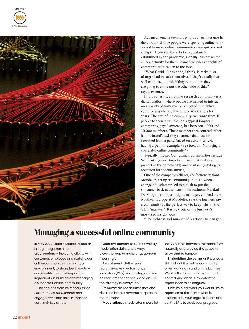 Sponsor Advancements in technology, plus a vast increase in the amount of time people were spending online, only served to make online communities even quicker and cheaper. However, the set of circumstances established by the pandemic, globally, has presented an opportunity for the customer-closeness benefits of communities to return to the fore. What Covid-19 has done, I think, is make a lot of organisations ask themselves if theyre really that well connected and, if theyre not, how they are going to come out the other side of this, says Lawrence. In broad terms, an online research community is a digital platform where people are invited to interact on a variety of tasks over a period of time, which could be anywhere between one week and a few years. The size of the community can range from 10 people to thousands, though a typical long-term community, says Lawrence, has between 1,000 and 10,000 members. These members are sourced either from a brands existing customer database or recruited from a panel based on certain criteria having a pet, for example. (See boxout, Managing a successful online community.) Typically, InSites Consultings communities include residents (a core target audience that is always present in the community) and visitors (sub-targets recruited for specific studies). One of the companys clients, confectionery giant ondel , set up its community in , when a change of leadership led to a push to put the consumer back at the heart of its business. Malakai De-Morgan, shopper insights manager, confectionery, orthern urope at ondel , says the business saw a community as the perfect way to keep tabs on the UKs snackers. It is now one of the businesss most-used insight tools. The richness and number of reactions we can get, Managing a successful online community In May 2020, Explain Market Research Content: content should be weekly, brought together nine moderation daily, and always customer, employee and stakeholder meaningful organisations including clients with online communities in a virtual close the loop to make engagement Recruitment: define our environment, to share best practice recruitment key performance ingredients in building and managing on recruitment channels, and ensure and identify the most important a successful online community. he findin s ro its re ort, Online communities: for research and engagement, can be summarised across six key areas: indicators (KPIs) and strategy, decide the strategy is always on Rewards: do not assume that one si e fits all the member a e re ards bes o e to Moderation: a moderator should let conversation bet een e bers o naturally and provide the space to allow that to happen Embedding the community: always think about the online community when working in and on the business. What is the latest news, what can be shared, and what is important to report back to colleagues? KPIs: be clear what you would like to report on at the start what is important to your organisation and set the KPIs to track your progress. 22 Impact ISSUE 31 20_pp20-29_Report.indd 22 22/09/2020 16:03