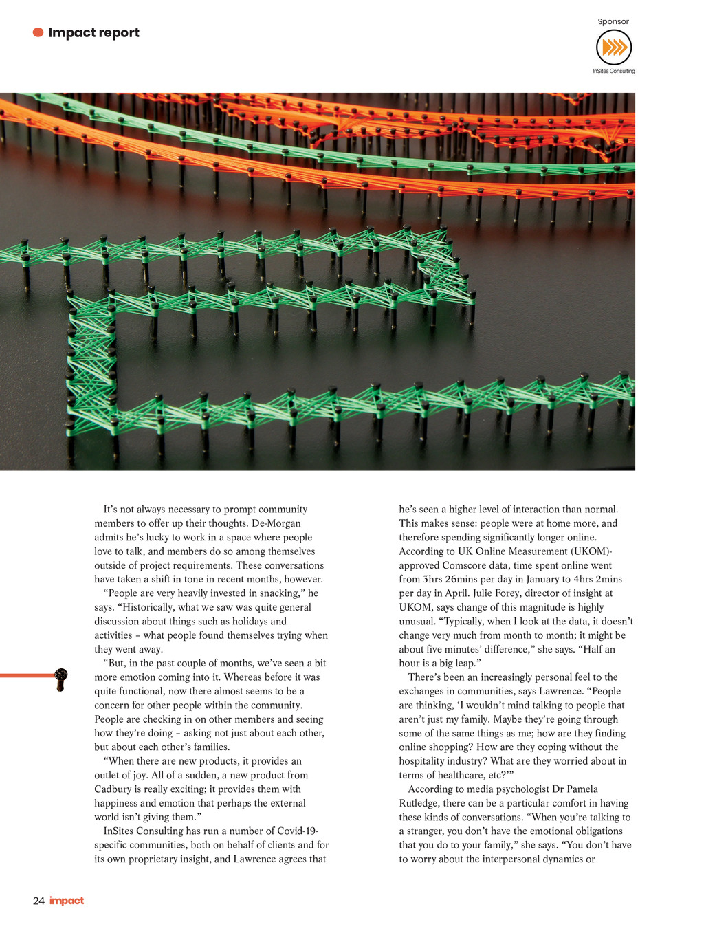 Impact report Its not always necessary to prompt community members to offer up their thoughts. e organ admits hes lucky to work in a space where people love to talk, and members do so among themselves outside of project requirements. These conversations have taken a shift in tone in recent months, however. eople are very heavily invested in snacking, he says. istorically, what we saw was uite general discussion about things such as holidays and activities what people found themselves trying when they went away. But, in the past couple of months, weve seen a bit more emotion coming into it. Whereas before it was quite functional, now there almost seems to be a concern for other people within the community. People are checking in on other members and seeing how theyre doing asking not just about each other, but about each others families. When there are new products, it provides an outlet of joy. All of a sudden, a new product from Cadbury is really exciting; it provides them with happiness and emotion that perhaps the external world isn t giving them. InSites Consulting has run a number of Covid-19specific communities, both on behalf of clients and for its own proprietary insight, and Lawrence agrees that Sponsor hes seen a higher level of interaction than normal. This makes sense: people were at home more, and therefore spending significantly longer online. According to UK Online Measurement (UKOM)approved Comscore data, time spent online went from 3hrs 26mins per day in January to 4hrs 2mins per day in April. Julie Forey, director of insight at UKOM, says change of this magnitude is highly unusual. Typically, when I look at the data, it doesnt change very much from month to month; it might be about five minutes difference, she says. alf an hour is a big leap. Theres been an increasingly personal feel to the exchanges in communities, says Lawrence. People are thinking, I wouldnt mind talking to people that arent just my family. Maybe theyre going through some of the same things as me; how are they finding online shopping ow are they coping without the hospitality industry? What are they worried about in terms of healthcare, etc According to media psychologist Dr Pamela Rutledge, there can be a particular comfort in having these kinds of conversations. When youre talking to a stranger, you dont have the emotional obligations that you do to your family, she says. ou don t have to worry about the interpersonal dynamics or 24 Impact ISSUE 31 20_pp20-29_Report.indd 24 18/09/2020 11:39 JTD_In