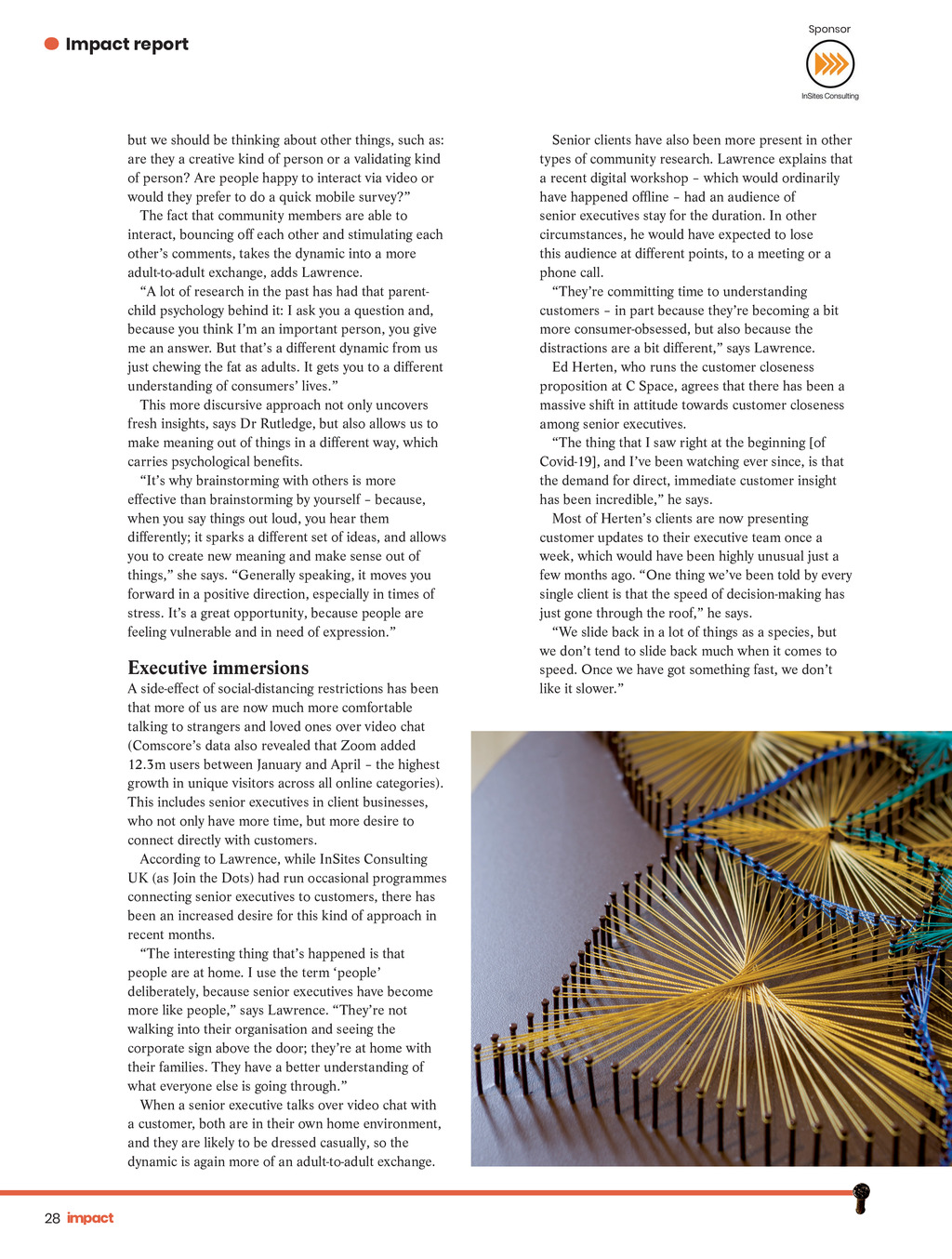 Impact report but we should be thinking about other things, such as: are they a creative kind of person or a validating kind of person? Are people happy to interact via video or would they prefer to do a uick mobile survey The fact that community members are able to interact, bouncing off each other and stimulating each others comments, takes the dynamic into a more adult-to-adult exchange, adds Lawrence. A lot of research in the past has had that parentchild psychology behind it: I ask you a question and, because you think Im an important person, you give me an answer. ut that s a different dynamic from us ust chewing the fat as adults. It gets you to a different understanding of consumers lives. This more discursive approach not only uncovers fresh insights, says Dr Rutledge, but also allows us to make meaning out of things in a different way, which carries psychological benefits. Its why brainstorming with others is more effective than brainstorming by yourself because, when you say things out loud, you hear them differently it sparks a different set of ideas, and allows you to create new meaning and make sense out of things, she says. enerally speaking, it moves you forward in a positive direction, especially in times of stress. Its a great opportunity, because people are feeling vulnerable and in need of expression. Executive immersions side effect of social distancing restrictions has been that more of us are now much more comfortable talking to strangers and loved ones over video chat (Comscores data also revealed that Zoom added 12.3m users between January and April the highest growth in unique visitors across all online categories). This includes senior executives in client businesses, who not only have more time, but more desire to connect directly with customers. According to Lawrence, while InSites Consulting UK (as Join the Dots) had run occasional programmes connecting senior executives to customers, there has been an increased desire for this kind of approach in recent months. The interesting thing thats happened is that people are at home. I use the term people deliberately, because senior executives have become more like people, says awrence. They re not walking into their organisation and seeing the corporate sign above the door they re at home with their families. They have a better understanding of what everyone else is going through. When a senior executive talks over video chat with a customer, both are in their own home environment, and they are likely to be dressed casually, so the dynamic is again more of an adult-to-adult exchange. Sponsor Senior clients have also been more present in other types of community research. Lawrence explains that a recent digital workshop which would ordinarily have happened o ine had an audience of senior executives stay for the duration. In other circumstances, he would have expected to lose this audience at different points, to a meeting or a phone call. Theyre committing time to understanding customers in part because theyre becoming a bit more consumer-obsessed, but also because the distractions are a bit different, says awrence. Ed Herten, who runs the customer closeness proposition at C Space, agrees that there has been a massive shift in attitude towards customer closeness among senior executives. The thing that I saw right at the beginning [of Covid-19], and Ive been watching ever since, is that the demand for direct, immediate customer insight has been incredible, he says. Most of Hertens clients are now presenting customer updates to their executive team once a week, which would have been highly unusual just a few months ago. One thing weve been told by every single client is that the speed of decision-making has ust gone through the roof, he says. We slide back in a lot of things as a species, but we dont tend to slide back much when it comes to speed. Once we have got something fast, we dont like it slower. 28 Impact ISSUE 31 20_pp20-29_Report.indd 28 18/09/2020 11:39