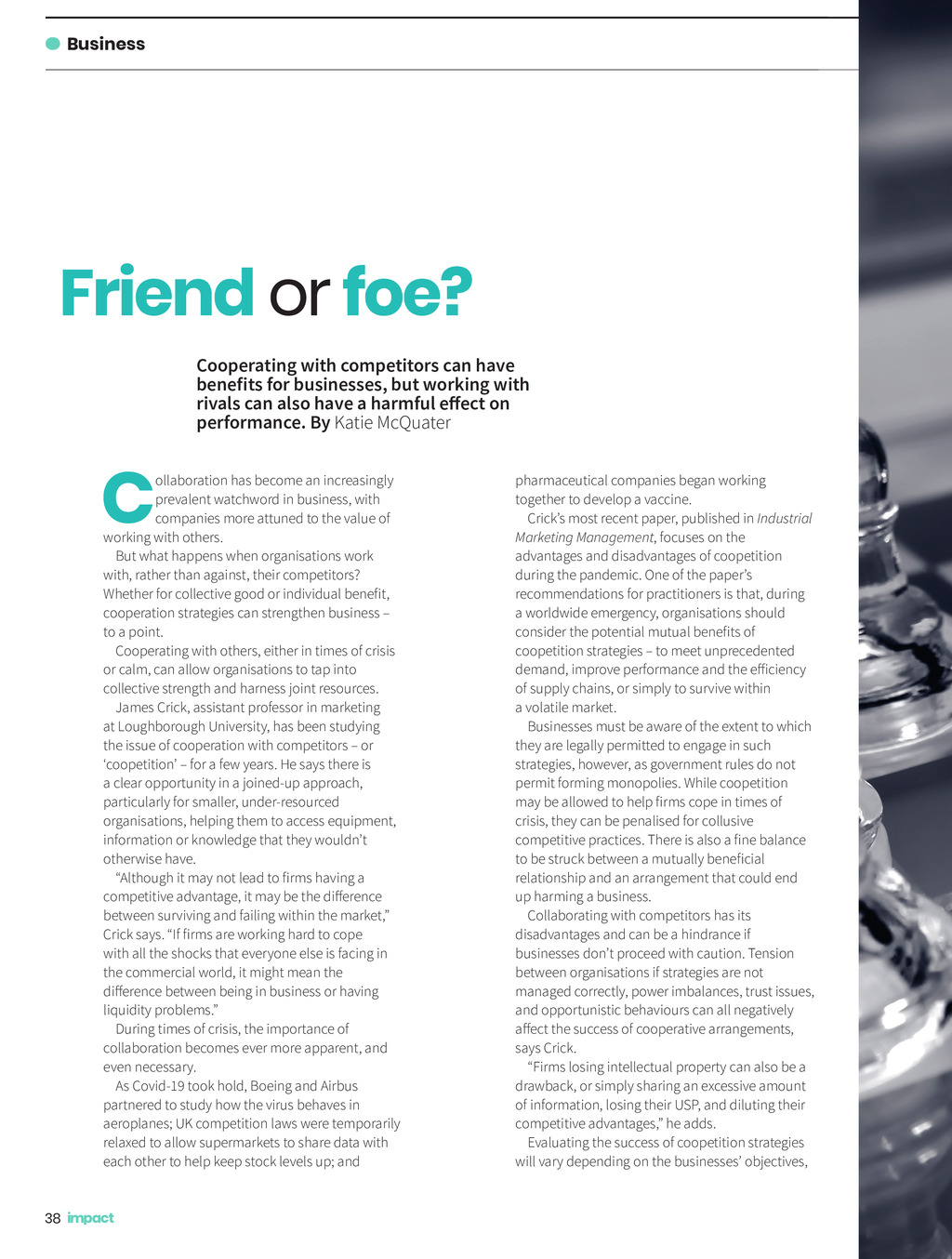 Business Friend or foe? Cooperating with competitors can have benefits for businesses, but working with rivals can also have a har ful e ect on perfor ance y Katie McQuater C ollaboration has become an increasingly prevalent watchword in business, with companies more attuned to the value of working with others. But what happens when organisations work with, rather than against, their competitors? hether for collective good or individual benefit, cooperation strategies can strengthen business to a point. Cooperating with others, either in times of crisis or calm, can allow organisations to tap into collective strength and harness joint resources. James Crick, assistant professor in marketing at Loughborough University, has been studying the issue of cooperation with competitors or coopetition for a few years. He says there is a clear opportunity in a joined-up approach, particularly for smaller, under-resourced organisations, helping them to access equipment, information or knowledge that they wouldnt otherwise have. lthough it may not lead to firms having a competitive advantage, it may be the difference between surviving and failing within the market, rick says. f firms are working hard to cope with all the shocks that everyone else is facing in the commercial world, it might mean the difference between being in business or having liquidity problems. During times of crisis, the importance of collaboration becomes ever more apparent, and even necessary. As Covid-19 took hold, Boeing and Airbus partnered to study how the virus behaves in aeroplanes; UK competition laws were temporarily relaxed to allow supermarkets to share data with each other to help keep stock levels up; and pharmaceutical companies began working together to develop a vaccine. Cricks most recent paper, published in Industrial Marketing Management, focuses on the advantages and disadvantages of coopetition during the pandemic. One of the papers recommendations for practitioners is that, during a worldwide emergency, organisations should consider the potential mutual benefits of coopetition strategies to meet unprecedented demand, improve performance and the efficiency of supply chains, or simply to survive within a volatile market. Businesses must be aware of the extent to which they are legally permitted to engage in such strategies, however, as government rules do not permit forming monopolies. While coopetition may be allowed to help firms cope in times of crisis, they can be penalised for collusive competitive practices. There is also a fine balance to be struck between a mutually beneficial relationship and an arrangement that could end up harming a business. Collaborating with competitors has its disadvantages and can be a hindrance if businesses dont proceed with caution. Tension between organisations if strategies are not managed correctly, power imbalances, trust issues, and opportunistic behaviours can all negatively affect the success of cooperative arrangements, says Crick. Firms losing intellectual property can also be a drawback, or simply sharing an excessive amount of information, losing their USP, and diluting their competitive advantages, he adds. Evaluating the success of coopetition strategies will vary depending on the businesses objectives, 38 Impact ISSUE 31 20_pp38-39_Business.indd 38 18/09/2020 11:49