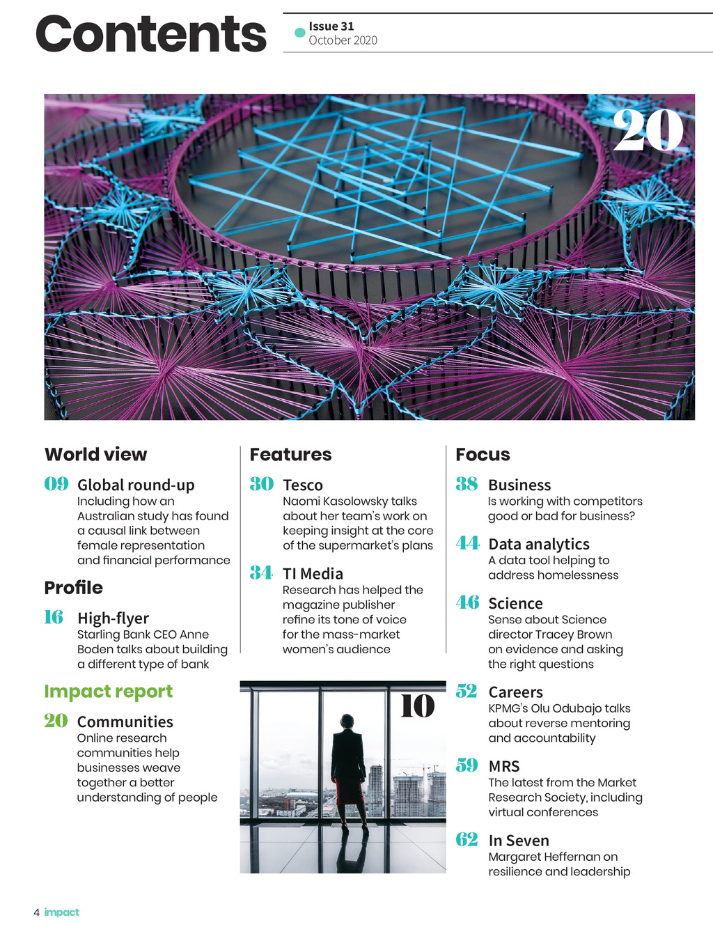 Contents Issue 31 October 2020 20 World view 09 Global round-up Including how an Australian study has found a causal link between female representation and financial er or ance rofi e 16 igh yer Starling Bank CEO Anne Boden talks about building a different type of bank Impact report 20 o unities Online research communities help businesses weave together a better understanding of people Features Focus 30 esco Naomi Kasolowsky talks about her teams work on keeping insight at the core of the supermarkets plans 34 38 44 ata analytics A data tool helping to address homelessness edia Research has helped the magazine publisher refine its tone o voice for the mass-market womens audience 10 usiness Is working with competitors good or bad for business? 46 cience Sense about Science director Tracey Brown on evidence and asking the right questions 52 areers KPMGs Olu Odubajo talks about reverse mentoring and accountability 59 MRS The latest from the Market Research Society, including virtual conferences 62 n even Margaret Heffernan on resilience and leadership 4 Impact ISSUE 31 20_pp4-5_contents.indd 4 18/09/2020 09:57