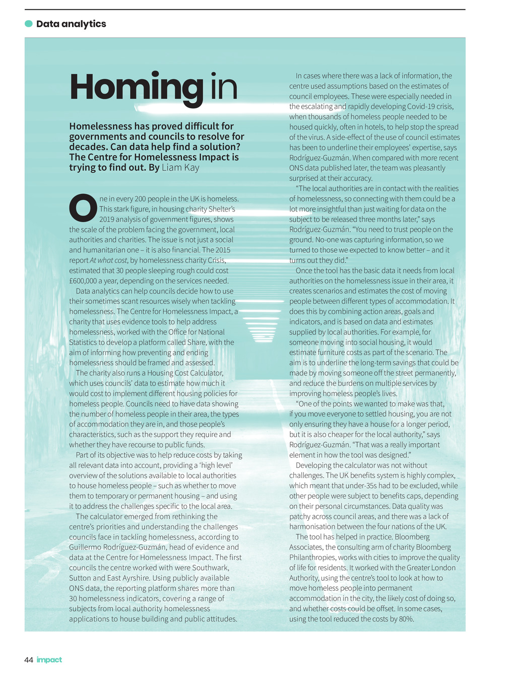 Data analytics Homing in o elessness has proved di icult for govern ents and councils to resolve for decades an data help find a solution he entre for o elessness pact is trying to find out y Liam Kay O ne in every 200 people in the UK is homeless. This stark figure, in housing charity helters analysis of government figures, shows the scale of the problem facing the government, local authorities and charities. The issue is not ust a social and humanitarian one it is also financial. The report At what cost, by homelessness charity risis, estimated that people sleeping rough could cost , a year, depending on the services needed. ata analytics can help councils decide how to use their sometimes scant resources wisely when tackling homelessness. The entre for omelessness mpact, a charity that uses evidence tools to help address homelessness, worked with the ffice for ational tatistics to develop a platform called hare, with the aim of informing how preventing and ending homelessness should be framed and assessed. The charity also runs a ousing ost alculator, which uses councils data to estimate how much it would cost to implement different housing policies for homeless people. ouncils need to have data showing the number of homeless people in their area, the types of accommodation they are in, and those peoples characteristics, such as the support they re uire and whether they have recourse to public funds. Part of its ob ective was to help reduce costs by taking all relevant data into account, providing a high level overview of the solutions available to local authorities to house homeless people such as whether to move them to temporary or permanent housing and using it to address the challenges specific to the local area. The calculator emerged from rethinking the centres priorities and understanding the challenges councils face in tackling homelessness, according to uillermo odr gue u m n, head of evidence and data at the entre for omelessness mpact. The first councils the centre worked with were outhwark, utton and ast yrshire. sing publicly available data, the reporting platform shares more than homelessness indicators, covering a range of sub ects from local authority homelessness applications to house building and public attitudes. n cases where there was a lack of information, the centre used assumptions based on the estimates of council employees. These were especially needed in the escalating and rapidly developing ovid crisis, when thousands of homeless people needed to be housed uickly, o en in hotels, to help stop the spread of the virus. side effect of the use of council estimates has been to underline their employees expertise, says odr gue u m n. hen compared with more recent data published later, the team was pleasantly surprised at their accuracy. The local authorities are in contact with the realities of homelessness, so connecting with them could be a lot more insightful than ust waiting for data on the sub ect to be released three months later, says odr gue u m n. ou need to trust people on the ground. o one was capturing information, so we turned to those we expected to know better and it turns out they did. nce the tool has the basic data it needs from local authorities on the homelessness issue in their area, it creates scenarios and estimates the cost of moving people between different types of accommodation. t does this by combining action areas, goals and indicators, and is based on data and estimates supplied by local authorities. or example, for someone moving into social housing, it would estimate furniture costs as part of the scenario. The aim is to underline the long term savings that could be made by moving someone off the street permanently, and reduce the burdens on multiple services by improving homeless peoples lives. ne of the points we wanted to make was that, if you move everyone to settled housing, you are not only ensuring they have a house for a longer period, but it is also cheaper for the local authority, says odr gue u m n. That was a really important element in how the tool was designed. eveloping the calculator was not without challenges. The benefits system is highly complex, which meant that under s had to be excluded, while other people were sub ect to benefits caps, depending on their personal circumstances. ata uality was patchy across council areas, and there was a lack of harmonisation between the four nations of the . The tool has helped in practice. loomberg ssociates, the consulting arm of charity loomberg Philanthropies, works with cities to improve the uality of life for residents. t worked with the reater ondon uthority, using the centres tool to look at how to move homeless people into permanent accommodation in the city, the likely cost of doing so, and whether costs could be offset. n some cases, using the tool reduced the costs by . 44 Impact ISSUE 31 20_pp44 Data.indd 44 18/09/2020 11:52