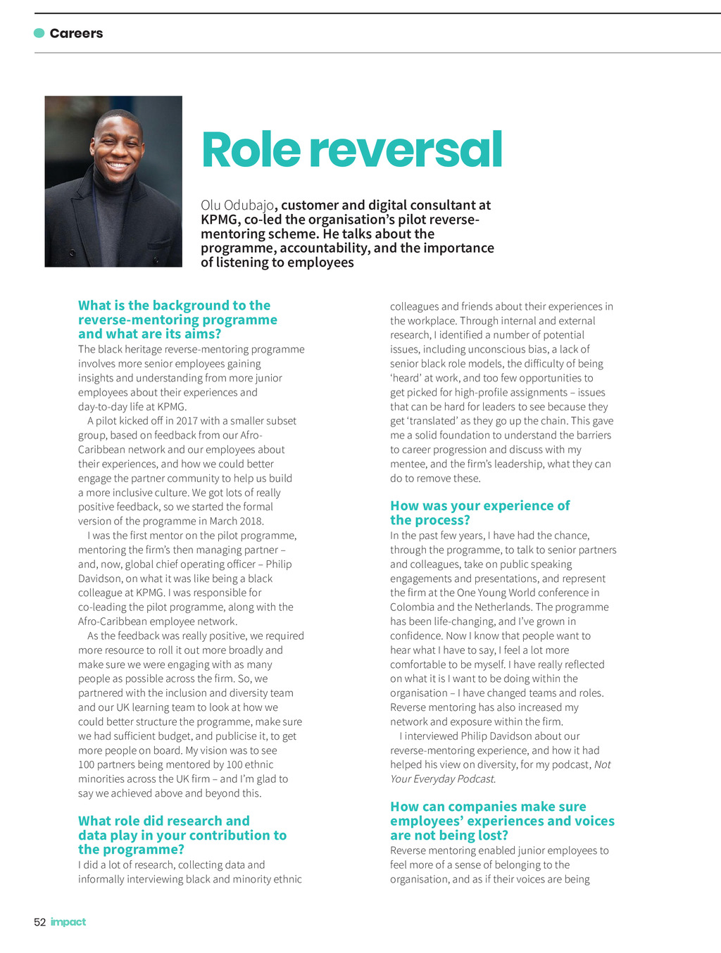 Careers Role reversal Olu Odubajo, customer and digital consultant at KPMG, co-led the organisations pilot reversementoring scheme. He talks about the programme, accountability, and the importance of listening to employees What is the background to the reverse-mentoring programme and what are its aims? The black heritage reverse-mentoring programme involves more senior employees gaining insights and understanding from more junior employees about their experiences and day-to-day life at KPMG. pilot kicked off in with a smaller subset group, based on feedback from our Afroaribbean network and our employees about their experiences, and how we could better engage the partner community to help us build a more inclusive culture. We got lots of really positive feedback, so we started the formal version of the programme in arch . was the first mentor on the pilot programme, mentoring the firms then managing partner and, now, global chief operating officer Philip avidson, on what it was like being a black colleague at P . was responsible for co leading the pilot programme, along with the fro aribbean employee network. s the feedback was really positive, we re uired more resource to roll it out more broadly and make sure we were engaging with as many people as possible across the firm. o, we partnered with the inclusion and diversity team and our learning team to look at how we could better structure the programme, make sure we had sufficient budget, and publicise it, to get more people on board. y vision was to see partners being mentored by ethnic minorities across the firm and m glad to say we achieved above and beyond this. What role did research and data play in your contribution to the programme? I did a lot of research, collecting data and informally interviewing black and minority ethnic colleagues and friends about their experiences in the workplace. Through internal and external research, identified a number of potential issues, including unconscious bias, a lack of senior black role models, the difficulty of being heard at work, and too few opportunities to get picked for high profile assignments issues that can be hard for leaders to see because they get translated as they go up the chain. This gave me a solid foundation to understand the barriers to career progression and discuss with my mentee, and the firms leadership, what they can do to remove these. How was your experience of the process? n the past few years, have had the chance, through the programme, to talk to senior partners and colleagues, take on public speaking engagements and presentations, and represent the firm at the ne oung orld conference in Colombia and the Netherlands. The programme has been life changing, and ve grown in confidence. ow know that people want to hear what have to say, feel a lot more comfortable to be myself. have really reflected on what it is want to be doing within the organisation have changed teams and roles. Reverse mentoring has also increased my network and exposure within the firm. interviewed Philip avidson about our reverse mentoring experience, and how it had helped his view on diversity, for my podcast, Not our veryday Podcast. How can companies make sure employees experiences and voices are not being lost? Reverse mentoring enabled junior employees to feel more of a sense of belonging to the organisation, and as if their voices are being 52 Impact ISSUE 31 20_pp52-53_Careers.indd 52 18/09/2020 11:59