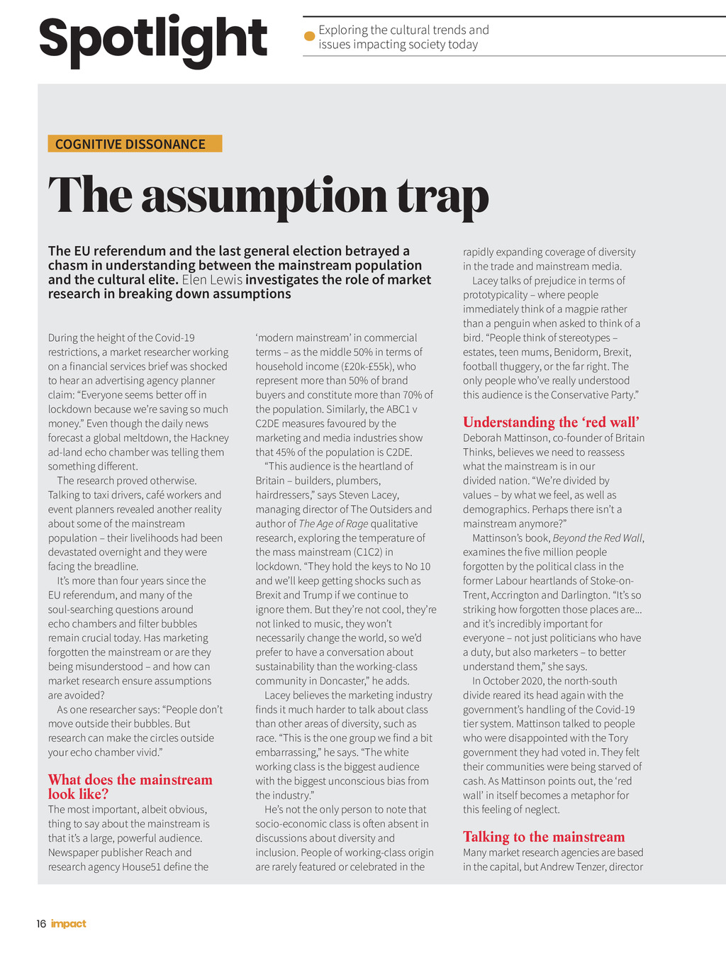 Spotlight Exploring the cultural trends and issues impacting society today COGNITIVE DISSONANCE The assumption trap The EU referendum and the last general election betrayed a chasm in understanding between the mainstream population and the cultural elite. Elen Lewis investigates the role of market research in breaking down assumptions During the height of the Covid-19 restrictions, a market researcher working on a financial services brief was shocked to hear an advertising agency planner claim: Everyone seems better off in lockdown because were saving so much money. Even though the daily news forecast a global meltdown, the Hackney ad-land echo chamber was telling them something different. The research proved otherwise. Talking to taxi drivers, caf workers and event planners revealed another reality about some of the mainstream population their livelihoods had been devastated overnight and they were facing the breadline. Its more than four years since the EU referendum, and many of the soul-searching questions around echo chambers and filter bubbles remain crucial today. Has marketing forgotten the mainstream or are they being misunderstood and how can market research ensure assumptions are avoided? As one researcher says: People dont move outside their bubbles. But research can make the circles outside your echo chamber vivid. What does the mainstream look like? The most important, albeit obvious, thing to say about the mainstream is that its a large, powerful audience. Newspaper publisher Reach and research agency House51 define the 16 modern mainstream in commercial terms as the middle 50% in terms of household income (20k-55k), who represent more than 50% of brand buyers and constitute more than 70% of the population. Similarly, the ABC1 v C2DE measures favoured by the marketing and media industries show that 45% of the population is C2DE. This audience is the heartland of Britain builders, plumbers, hairdressers, says Steven Lacey, managing director of The Outsiders and author of The Age of Rage qualitative research, exploring the temperature of the mass mainstream (C1C2) in lockdown. They hold the keys to No 10 and well keep getting shocks such as Brexit and Trump if we continue to ignore them. But theyre not cool, theyre not linked to music, they wont necessarily change the world, so wed prefer to have a conversation about sustainability than the working-class community in Doncaster, he adds. Lacey believes the marketing industry finds it much harder to talk about class than other areas of diversity, such as race. This is the one group we find a bit embarrassing, he says. The white working class is the biggest audience with the biggest unconscious bias from the industry. Hes not the only person to note that socio-economic class is often absent in discussions about diversity and inclusion. People of working-class origin are rarely featured or celebrated in the rapidly expanding coverage of diversity in the trade and mainstream media. Lacey talks of prejudice in terms of prototypicality where people immediately think of a magpie rather than a penguin when asked to think of a bird. People think of stereotypes estates, teen mums, Benidorm, Brexit, football thuggery, or the far right. The only people whove really understood this audience is the Conservative Party. Understanding the red wall Deborah Mattinson, co-founder of Britain Thinks, believes we need to reassess what the mainstream is in our divided nation. Were divided by values by what we feel, as well as demographics. Perhaps there isnt a mainstream anymore? Mattinsons book, Beyond the Red Wall, examines the five million people forgotten by the political class in the former Labour heartlands of Stoke-onTrent, Accrington and Darlington. Its so striking how forgotten those places are... and its incredibly important for everyone not just politicians who have a duty, but also marketers to better understand them, she says. In October 2020, the north-south divide reared its head again with the governments handling of the Covid-19 tier system. Mattinson talked to people who were disappointed with the Tory government they had voted in. They felt their communities were being starved of cash. As Mattinson points out, the red wall in itself becomes a metaphor for this feeling of neglect. Talking to the mainstream Many market research agencies are based in the capital, but Andrew Tenzer, director