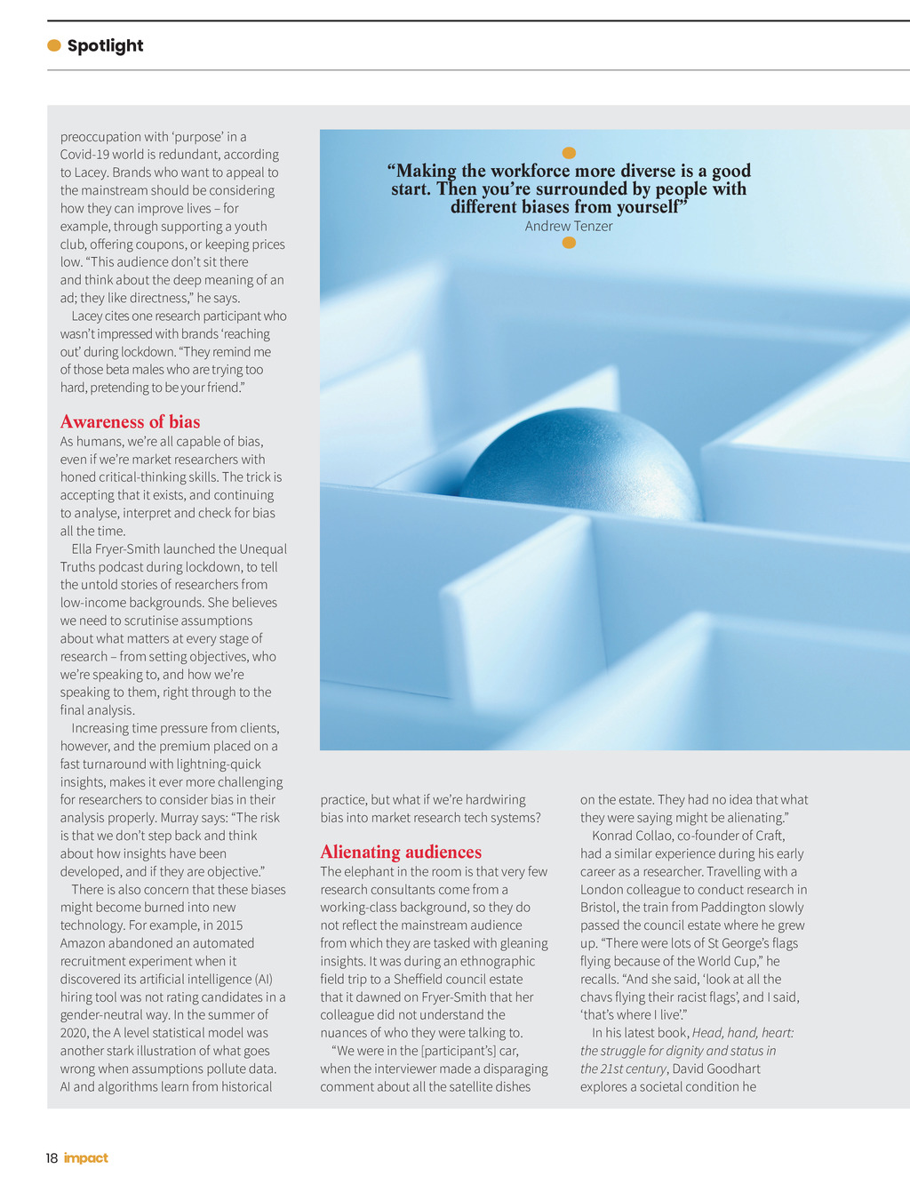 Spotlight preoccupation with purpose in a Covid-19 world is redundant, according to Lacey. Brands who want to appeal to the mainstream should be considering how they can improve lives for example, through supporting a youth club, offering coupons, or keeping prices low. This audience dont sit there and think about the deep meaning of an ad; they like directness, he says. Lacey cites one research participant who wasnt impressed with brands reaching out during lockdown. They remind me of those beta males who are trying too hard, pretending to be your friend. Making the workforce more diverse is a good start. Then youre surrounded by people with different biases from yourself Andrew Tenzer Awareness of bias As humans, were all capable of bias, even if were market researchers with honed critical-thinking skills. The trick is accepting that it exists, and continuing to analyse, interpret and check for bias all the time. Ella Fryer-Smith launched the Unequal Truths podcast during lockdown, to tell the untold stories of researchers from low-income backgrounds. She believes we need to scrutinise assumptions about what matters at every stage of research from setting objectives, who were speaking to, and how were speaking to them, right through to the final analysis. Increasing time pressure from clients, however, and the premium placed on a fast turnaround with lightning-quick insights, makes it ever more challenging for researchers to consider bias in their analysis properly. Murray says: The risk is that we dont step back and think about how insights have been developed, and if they are objective. There is also concern that these biases might become burned into new technology. For example, in 2015 Amazon abandoned an automated recruitment experiment when it discovered its artificial intelligence (AI) hiring tool was not rating candidates in a gender-neutral way. In the summer of 2020, the A level statistical model was another stark illustration of what goes wrong when assumptions pollute data. AI and algorithms learn from historical 18 practice, but what if were hardwiring bias into market research tech systems? Alienating audiences The elephant in the room is that very few research consultants come from a working-class background, so they do not reflect the mainstream audience from which they are tasked with gleaning insights. It was during an ethnographic field trip to a Sheffield council estate that it dawned on Fryer-Smith that her colleague did not understand the nuances of who they were talking to. We were in the [participants] car, when the interviewer made a disparaging comment about all the satellite dishes on the estate. They had no idea that what they were saying might be alienating. Konrad Collao, co-founder of Craft, had a similar experience during his early career as a researcher. Travelling with a London colleague to conduct research in Bristol, the train from Paddington slowly passed the council estate where he grew up. There were lots of St Georges flags flying because of the World Cup, he recalls. And she said, look at all the chavs flying their racist flags, and I said, thats where I live. In his latest book, Head, hand, heart: the struggle for dignity and status in the 21st century, David Goodhart explores a societal condition he