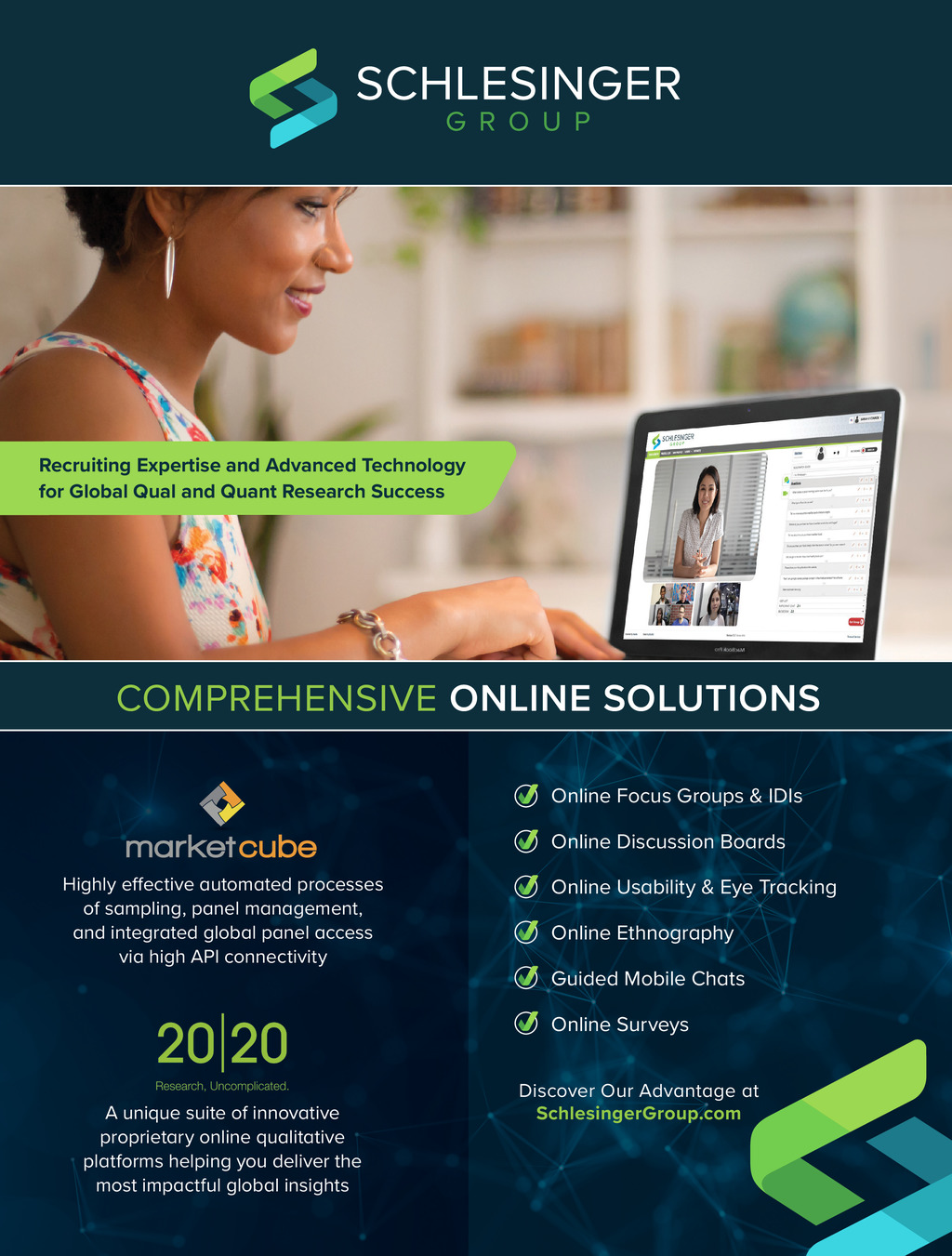 Recruiting Expertise and Advanced Technology for Global Qual and Quant Research Success COMPREHENSIVE ONLINE SOLUTIONS Online Focus Groups & IDIs Online Discussion Boards Highly effective automated processes of sampling, panel management, and integrated global panel access via high API connectivity Online Usability & Eye Tracking Online Ethnography Guided Mobile Chats Online Surveys A unique suite of innovative proprietary online qualitative platforms helping you deliver the most impactful global insights Discover Our Advantage at SchlesingerGroup.com