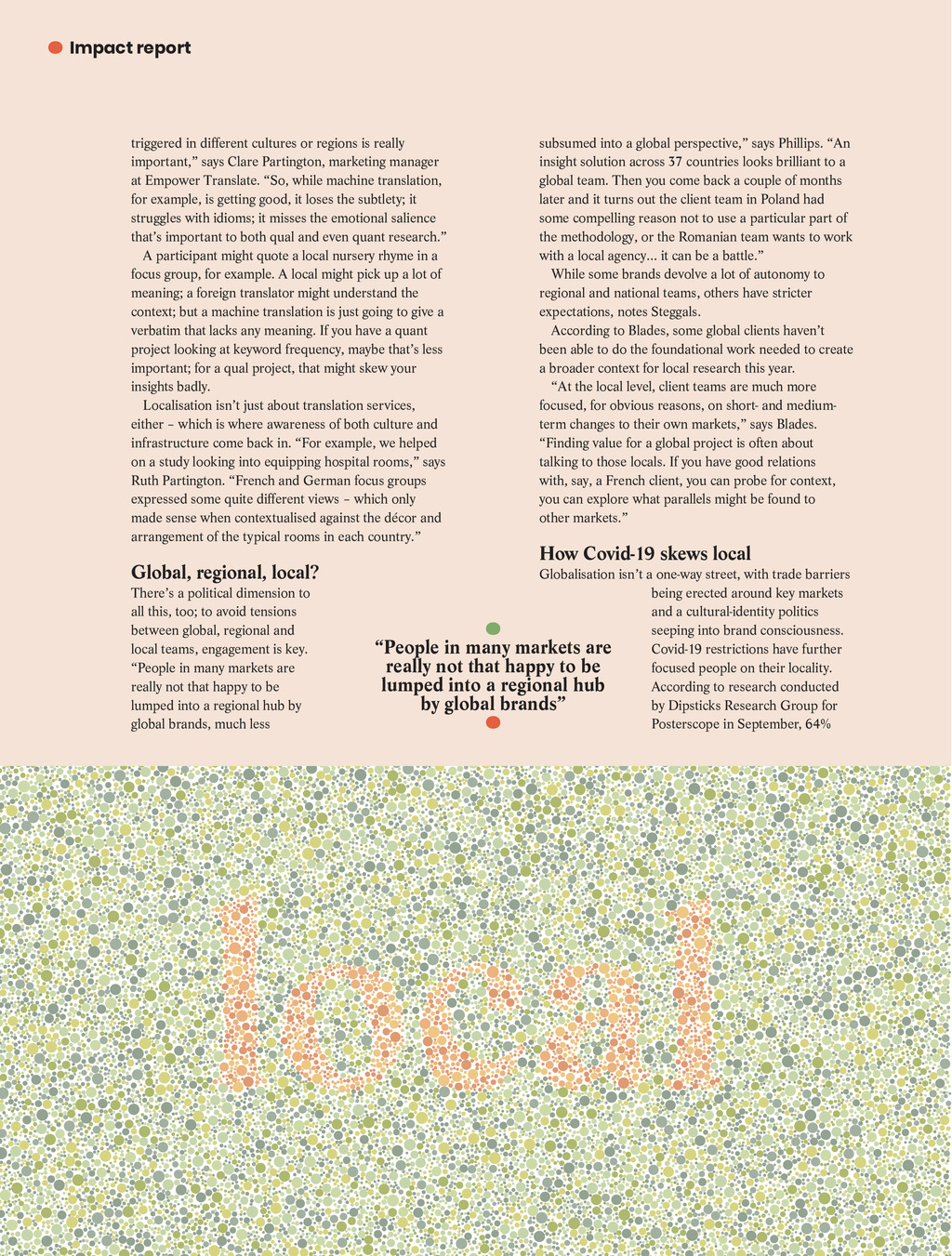 Impact report triggered in different cultures or regions is really important, says Clare Partington, marketing manager at Empower Translate. So, while machine translation, for example, is getting good, it loses the subtlety; it struggles with idioms; it misses the emotional salience thats important to both qual and even quant research. A participant might quote a local nursery rhyme in a focus group, for example. A local might pick up a lot of meaning; a foreign translator might understand the context; but a machine translation is just going to give a verbatim that lacks any meaning. If you have a quant project looking at keyword frequency, maybe thats less important; for a qual project, that might skew your insights badly. Localisation isnt just about translation services, either which is where awareness of both culture and infrastructure come back in. For example, we helped on a study looking into equipping hospital rooms, says Ruth Partington. French and German focus groups expressed some quite different views which only made sense when contextualised against the dcor and arrangement of the typical rooms in each country. Global, regional, local? Theres a political dimension to all this, too; to avoid tensions between global, regional and local teams, engagement is key. People in many markets are really not that happy to be lumped into a regional hub by global brands, much less subsumed into a global perspective, says Phillips. An insight solution across 37 countries looks brilliant to a global team. Then you come back a couple of months later and it turns out the client team in Poland had some compelling reason not to use a particular part of the methodology, or the Romanian team wants to work with a local agency it can be a battle. While some brands devolve a lot of autonomy to regional and national teams, others have stricter expectations, notes Steggals. According to Blades, some global clients havent been able to do the foundational work needed to create a broader context for local research this year. At the local level, client teams are much more focused, for obvious reasons, on short- and mediumterm changes to their own markets, says Blades. Finding value for a global project is often about talking to those locals. If you have good relations with, say, a French client, you can probe for context, you can explore what parallels might be found to other markets. How Covid-19 skews local Globalisation isnt a one-way street, with trade barriers being erected around key markets and a cultural-identity politics seeping into brand consciousness. Covid-19 restrictions have further People in many markets are focused people on their locality. really not that happy to be According to research conducted lumped into a regional hub by Dipsticks Research Group for by global brands Posterscope in September, 64%