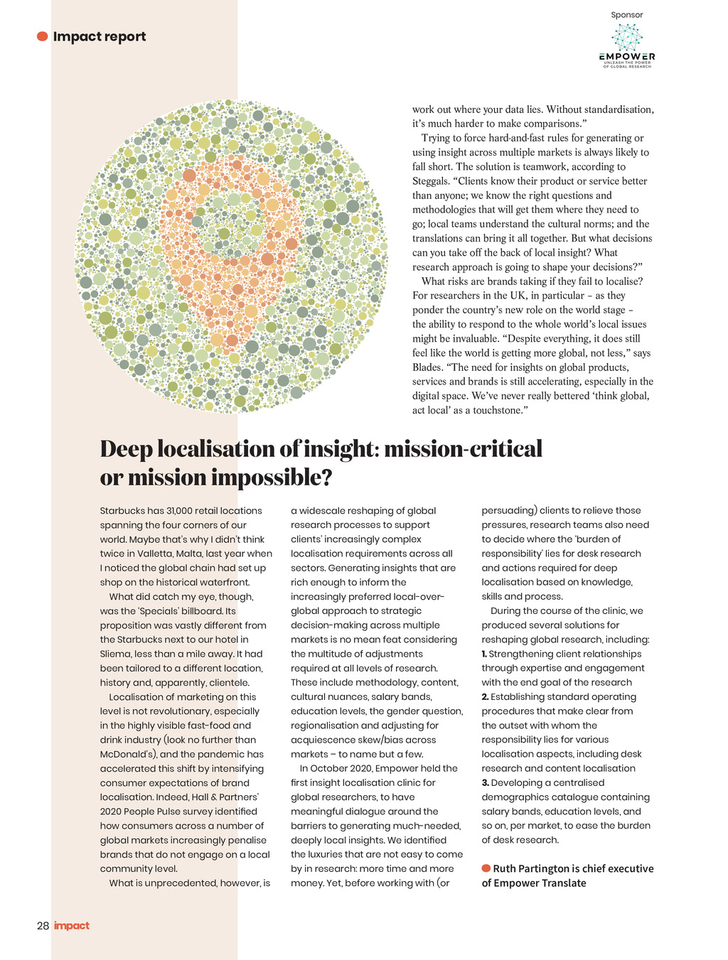 Sponsor Impact report work out where your data lies. Without standardisation, its much harder to make comparisons. Trying to force hard-and-fast rules for generating or using insight across multiple markets is always likely to fall short. The solution is teamwork, according to Steggals. Clients know their product or service better than anyone; we know the right questions and methodologies that will get them where they need to go; local teams understand the cultural norms; and the translations can bring it all together. But what decisions can you take off the back of local insight? What research approach is going to shape your decisions? What risks are brands taking if they fail to localise? For researchers in the UK, in particular as they ponder the countrys new role on the world stage the ability to respond to the whole worlds local issues might be invaluable. Despite everything, it does still feel like the world is getting more global, not less, says Blades. The need for insights on global products, services and brands is still accelerating, especially in the digital space. Weve never really bettered think global, act local as a touchstone. Deep localisation of insight: mission-critical or mission impossible?? Starbucks has 31,000 retail locations a widescale reshaping of global persuading) clients to relieve those world. Maybe thats why I didnt think clients increasingly complex to decide where the burden of spanning the four corners of our twice in Valletta, Malta, last year when I noticed the global chain had set up shop on the historical waterfront. What did catch my eye, though, was the Specials billboard. Its proposition was vastly different from the Starbucks next to our hotel in Sliema, less than a mile away. It had been tailored to a different location, history and, apparently, clientele. Localisation of marketing on this level is not revolutionary, especially in the highly visible fast-food and drink industry (look no further than McDonalds), and the pandemic has accelerated this shift by intensifying localisation requirements across all sectors. Generating insights that are rich enough to inform the increasingly preferred local-overglobal approach to strategic community level. What is unprecedented, however, is localisation based on knowledge, skills and process. During the course of the clinic, we 1. Strengthening client relationships required at all levels of research. These include methodology, content, cultural nuances, salary bands, education levels, the gender question, regionalisation and adjusting for acquiescence skew/bias across markets to name but a few. In October 2020, Empower held the meaningful dialogue around the brands that do not engage on a local and actions required for deep the multitude of adjustments markets is no mean feat considering 2020 People Pulse survey identified global markets increasingly penalise responsibility lies for desk research produced several solutions for first insight localisation clinic for how consumers across a number of pressures, research teams also need decision-making across multiple consumer expectations of brand localisation. Indeed, Hall & Partners 28 research processes to support global researchers, to have barriers to generating much-needed, deeply local insights. We identified the luxuries that are not easy to come by in research: more time and more money. Yet, before working with (or reshaping global research, including: through expertise and engagement with the end goal of the research 2. Establishing standard operating procedures that make clear from the outset with whom the responsibility lies for various localisation aspects, including desk research and content localisation 3. Developing a centralised demographics catalogue containing salary bands, education levels, and so on, per market, to ease the burden of desk research. Ruth Partington is chief executive of Empower Translate