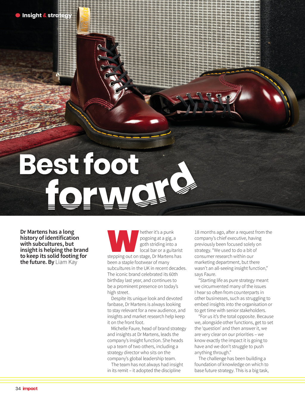 Insight & strategy Best foot Dr Martens has a long history of identification with subcultures, but insight is helping the brand to keep its solid footing for the future. By Liam Kay 34 W hether its a punk pogoing at a gig, a goth striding into a local bar or a guitarist stepping out on stage, Dr Martens has been a staple footwear of many subcultures in the UK in recent decades. The iconic brand celebrated its 60th birthday last year, and continues to be a prominent presence on todays high street. Despite its unique look and devoted fanbase, Dr Martens is always looking to stay relevant for a new audience, and insights and market research help keep it on the front foot. Michelle Faure, head of brand strategy and insights at Dr Martens, leads the companys insight function. She heads up a team of two others, including a strategy director who sits on the companys global leadership team. The team has not always had insight in its remit it adopted the discipline 18 months ago, after a request from the companys chief executive, having previously been focused solely on strategy. We used to do a bit of consumer research within our marketing department, but there wasnt an all-seeing insight function, says Faure. Starting life as pure strategy meant we circumvented many of the issues I hear so often from counterparts in other businesses, such as struggling to embed insights into the organisation or to get time with senior stakeholders. For us its the total opposite. Because we, alongside other functions, get to set the question and then answer it, we are very clear on our priorities we know exactly the impact it is going to have and we dont struggle to push anything through. The challenge has been building a foundation of knowledge on which to base future strategy. This is a big task,