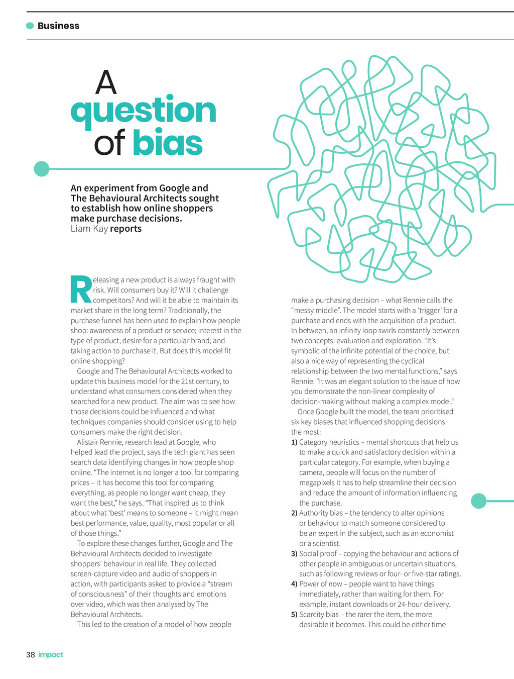 Business A question of bias An experiment from Google and The Behavioural Architects sought to establish how online shoppers make purchase decisions. Liam Kay reports R eleasing a new product is always fraught with risk. Will consumers buy it? Will it challenge competitors? And will it be able to maintain its market share in the long term? Traditionally, the purchase funnel has been used to explain how people shop: awareness of a product or service; interest in the type of product; desire for a particular brand; and taking action to purchase it. But does this model fit online shopping? Google and The Behavioural Architects worked to update this business model for the 21st century, to understand what consumers considered when they searched for a new product. The aim was to see how those decisions could be influenced and what techniques companies should consider using to help consumers make the right decision. Alistair Rennie, research lead at Google, who helped lead the project, says the tech giant has seen search data identifying changes in how people shop online. The internet is no longer a tool for comparing prices it has become this tool for comparing everything, as people no longer want cheap, they want the best, he says. That inspired us to think about what best means to someone it might mean best performance, value, quality, most popular or all of those things. To explore these changes further, Google and The Behavioural Architects decided to investigate shoppers behaviour in real life. They collected screen-capture video and audio of shoppers in action, with participants asked to provide a stream of consciousness of their thoughts and emotions over video, which was then analysed by The Behavioural Architects. This led to the creation of a model of how people 38 make a purchasing decision what Rennie calls the messy middle. The model starts with a trigger for a purchase and ends with the acquisition of a product. In between, an infinity loop swirls constantly between two concepts: evaluation and exploration. Its symbolic of the infinite potential of the choice, but also a nice way of representing the cyclical relationship between the two mental functions, says Rennie. It was an elegant solution to the issue of how you demonstrate the non-linear complexity of decision-making without making a complex model. Once Google built the model, the team prioritised six key biases that influenced shopping decisions the most: 1) Category heuristics mental shortcuts that help us to make a quick and satisfactory decision within a particular category. For example, when buying a camera, people will focus on the number of megapixels it has to help streamline their decision and reduce the amount of information influencing the purchase. 2) Authority bias the tendency to alter opinions or behaviour to match someone considered to be an expert in the subject, such as an economist or a scientist. 3) Social proof copying the behaviour and actions of other people in ambiguous or uncertain situations, such as following reviews or four- or five-star ratings. 4) Power of now people want to have things immediately, rather than waiting for them. For example, instant downloads or 24-hour delivery. 5) Scarcity bias the rarer the item, the more desirable it becomes. This could be either time