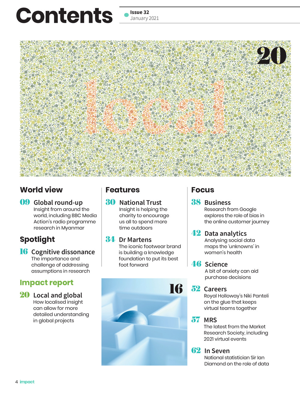 Contents Issue 32 January 2021 20 World view 09 Global round-up Insight from around the world, including BBC Media Actions radio programme research in Myanmar Spotlight 16 Cognitive dissonance The importance and challenge of addressing assumptions in research Impact report 20 Local and global How localised insight can allow for more detailed understanding in global projects Features Focus 30 N ational Trust 38 B usiness Insight is helping the charity to encourage us all to spend more time outdoors Research from Google explores the role of bias in the online customer journey 42 Data analytics 34 Dr Martens The iconic footwear brand is building a knowledge foundation to put its best foot forward 16 Analysing social data maps the unknowns in womens health 46 Science A bit of anxiety can aid purchase decisions 52 Careers Royal Holloways Niki Panteli on the glue that keeps virtual teams together 57 M RS The latest from the Market Research Society, including 2021 virtual events 62 In Seven National statistician Sir Ian Diamond on the role of data 4