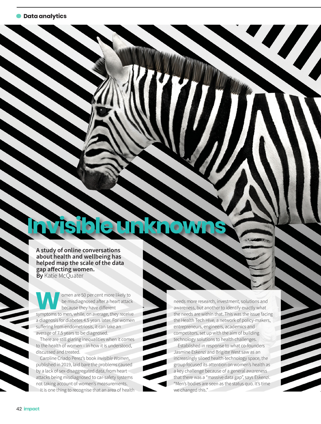 Data analytics Invisible unknowns A study of online conversations about health and wellbeing has helped map the scale of the data gap affecting women. By Katie McQuater W omen are 50 per cent more likely to be misdiagnosed after a heart attack because they have different symptoms to men, while, on average, they receive a diagnosis for diabetes 4.5 years later. For women suffering from endometriosis, it can take an average of 7.5 years to be diagnosed. There are still glaring inequalities when it comes to the health of women in how it is understood, discussed and treated. Caroline Criado Perezs book Invisible Women, published in 2019, laid bare the problems caused by a lack of sex-disaggregated data, from heart attacks being misdiagnosed to car-safety systems not taking account of womens measurements. It is one thing to recognise that an area of health 42 needs more research, investment, solutions and awareness, but another to identify exactly what the needs are within that. This was the issue facing the Health Tech Hive, a network of policy-makers, entrepreneurs, engineers, academics and competitors, set up with the aim of building technology solutions to health challenges. Established in response to what co-founders Jasmine Eskenzi and Brigitte West saw as an increasingly siloed health-technology space, the group focused its attention on womens health as a key challenge because of a general awareness that there was a massive data gap, says Eskenzi. Mens bodies are seen as the status quo. Its time we changed this.