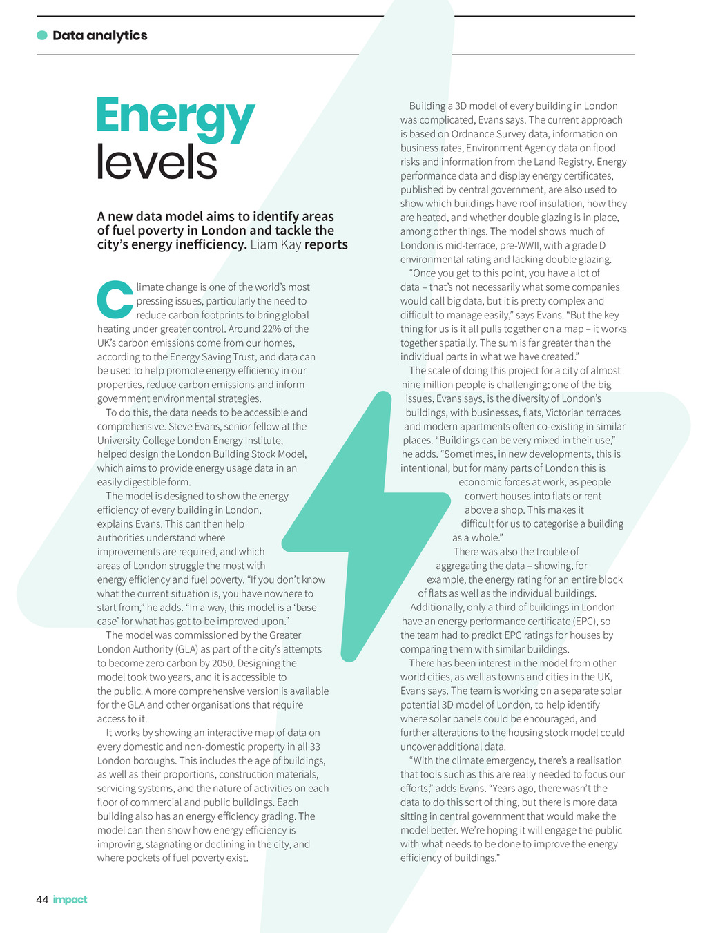 Data analytics Energy levels A new data model aims to identify areas of fuel poverty in London and tackle the citys energy inefficiency. Liam Kay reports C limate change is one of the worlds most pressing issues, particularly the need to reduce carbon footprints to bring global heating under greater control. Around 22% of the UKs carbon emissions come from our homes, according to the Energy Saving Trust, and data can be used to help promote energy efficiency in our properties, reduce carbon emissions and inform government environmental strategies. To do this, the data needs to be accessible and comprehensive. Steve Evans, senior fellow at the University College London Energy Institute, helped design the London Building Stock Model, which aims to provide energy usage data in an easily digestible form. The model is designed to show the energy efficiency of every building in London, explains Evans. This can then help authorities understand where improvements are required, and which areas of London struggle the most with energy efficiency and fuel poverty. If you dont know what the current situation is, you have nowhere to start from, he adds. In a way, this model is a base case for what has got to be improved upon. The model was commissioned by the Greater London Authority (GLA) as part of the citys attempts to become zero carbon by 2050. Designing the model took two years, and it is accessible to the public. A more comprehensive version is available for the GLA and other organisations that require access to it. It works by showing an interactive map of data on every domestic and non-domestic property in all 33 London boroughs. This includes the age of buildings, as well as their proportions, construction materials, servicing systems, and the nature of activities on each floor of commercial and public buildings. Each building also has an energy efficiency grading. The model can then show how energy efficiency is improving, stagnating or declining in the city, and where pockets of fuel poverty exist. 44 Building a 3D model of every building in London was complicated, Evans says. The current approach is based on Ordnance Survey data, information on business rates, Environment Agency data on flood risks and information from the Land Registry. Energy performance data and display energy certificates, published by central government, are also used to show which buildings have roof insulation, how they are heated, and whether double glazing is in place, among other things. The model shows much of London is mid-terrace, pre-WWII, with a grade D environmental rating and lacking double glazing. Once you get to this point, you have a lot of data thats not necessarily what some companies would call big data, but it is pretty complex and difficult to manage easily, says Evans. But the key thing for us is it all pulls together on a map it works together spatially. The sum is far greater than the individual parts in what we have created. The scale of doing this project for a city of almost nine million people is challenging; one of the big issues, Evans says, is the diversity of Londons buildings, with businesses, flats, Victorian terraces and modern apartments often co-existing in similar places. Buildings can be very mixed in their use, he adds. Sometimes, in new developments, this is intentional, but for many parts of London this is economic forces at work, as people convert houses into flats or rent above a shop. This makes it difficult for us to categorise a building as a whole. There was also the trouble of aggregating the data showing, for example, the energy rating for an entire block of flats as well as the individual buildings. Additionally, only a third of buildings in London have an energy performance certificate (EPC), so the team had to predict EPC ratings for houses by comparing them with similar buildings. There has been interest in the model from other world cities, as well as towns and cities in the UK, Evans says. The team is working on a separate solar potential 3D model of London, to help identify where solar panels could be encouraged, and further alterations to the housing stock model could uncover additional data. With the climate emergency, theres a realisation that tools such as this are really needed to focus our efforts, adds Evans. Years ago, there wasnt the data to do this sort of thing, but there is more data sitting in central government that would make the model better. Were hoping it will engage the public with what needs to be done to improve the energy efficiency of buildings.