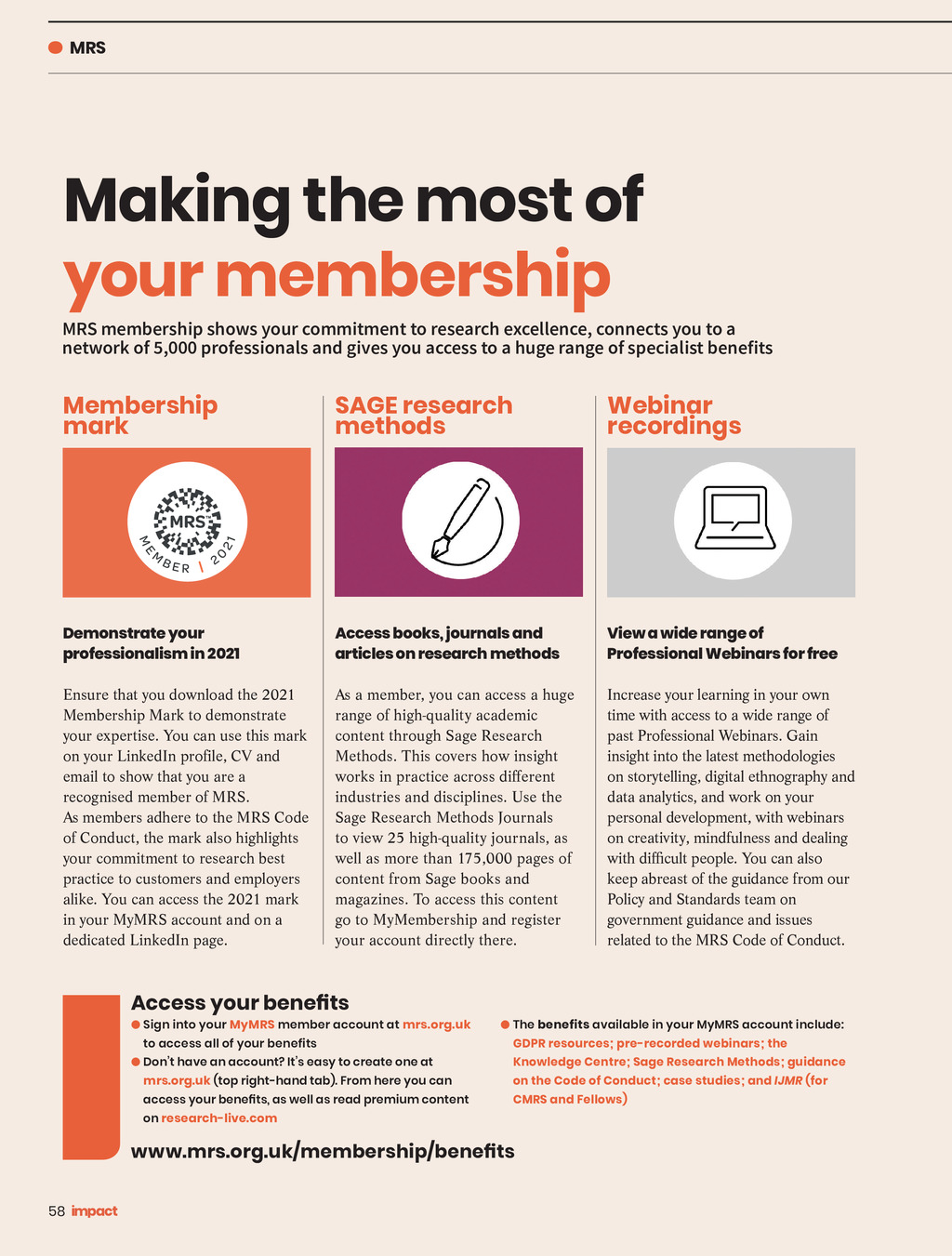 MRS Making the most of your membership MRS membership shows your commitment to research excellence, connects you to a network of 5,000 professionals and gives you access to a huge range of specialist benefits Webinar recordings Demonstrate your professionalism in 2021 Access books, journals and articles on research methods View a wide range of Professional Webinars for free Ensure that you download the 2021 Membership Mark to demonstrate your expertise. You can use this mark on your LinkedIn profile, CV and email to show that you are a recognised member of MRS. As members adhere to the MRS Code of Conduct, the mark also highlights your commitment to research best practice to customers and employers alike. You can access the 2021 mark in your MyMRS account and on a dedicated LinkedIn page. As a member, you can access a huge range of high-quality academic content through Sage Research Methods. This covers how insight works in practice across different industries and disciplines. Use the Sage Research Methods Journals to view 25 high-quality journals, as well as more than 175,000 pages of content from Sage books and magazines. To access this content go to MyMembership and register your account directly there. Increase your learning in your own time with access to a wide range of past Professional Webinars. Gain insight into the latest methodologies on storytelling, digital ethnography and data analytics, and work on your personal development, with webinars on creativity, mindfulness and dealing with difficult people. You can also keep abreast of the guidance from our Policy and Standards team on government guidance and issues related to the MRS Code of Conduct. M BE R I 2 0 ME SAGE research methods 21 Membership mark Access your benefits Sign into your MyMRS member account at mrs.org.uk to access all of your benefits Dont have an account? Its easy to create one at mrs.org.uk (top right-hand tab). From here you can access your benefits, as well as read premium content on research-live.com The benefits available in your MyMRS account include: GDPR resources; pre-recorded webinars; the Knowledge Centre; Sage Research Methods; guidance on the Code of Conduct; case studies; and IJMR (for CMRS and Fellows) www.mrs.org.uk/membership/benefits 58