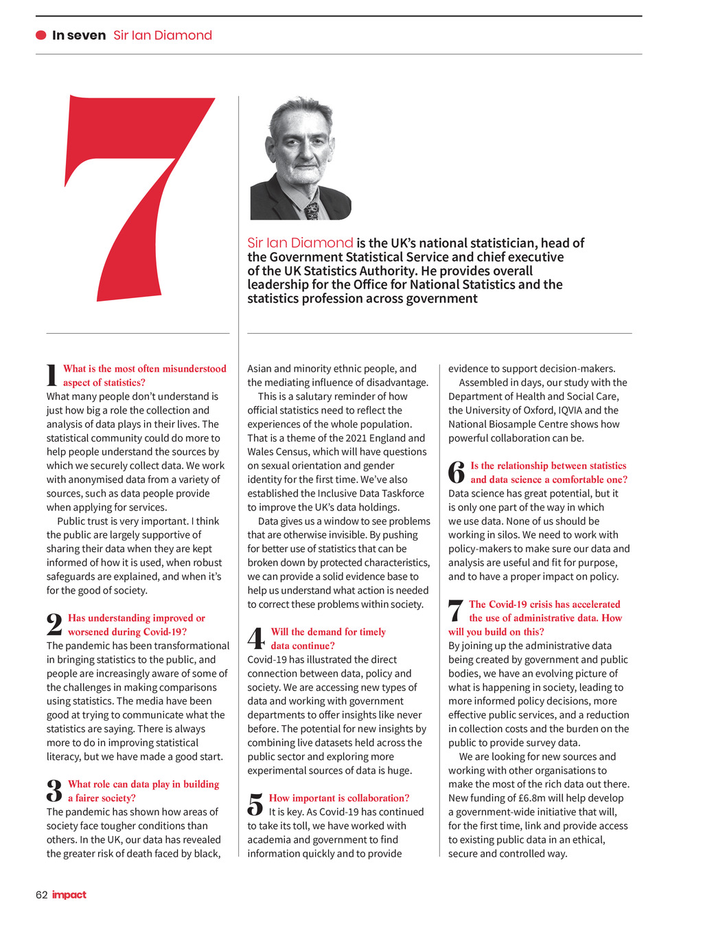 7 In seven Sir Ian Diamond 1 What is the most often misunderstood aspect of statistics? What many people dont understand is just how big a role the collection and analysis of data plays in their lives. The statistical community could do more to help people understand the sources by which we securely collect data. We work with anonymised data from a variety of sources, such as data people provide when applying for services. Public trust is very important. I think the public are largely supportive of sharing their data when they are kept informed of how it is used, when robust safeguards are explained, and when its for the good of society. Sir Ian Diamond is the UKs national statistician, head of the Government Statistical Service and chief executive of the UK Statistics Authority. He provides overall leadership for the Office for National Statistics and the statistics profession across government Asian and minority ethnic people, and the mediating influence of disadvantage. This is a salutary reminder of how official statistics need to reflect the experiences of the whole population. That is a theme of the 2021 England and Wales Census, which will have questions on sexual orientation and gender identity for the first time. Weve also established the Inclusive Data Taskforce to improve the UKs data holdings. Data gives us a window to see problems that are otherwise invisible. By pushing for better use of statistics that can be broken down by protected characteristics, we can provide a solid evidence base to help us understand what action is needed to correct these problems within society. 2 4 3 5 Has understanding improved or worsened during Covid-19? The pandemic has been transformational in bringing statistics to the public, and people are increasingly aware of some of the challenges in making comparisons using statistics. The media have been good at trying to communicate what the statistics are saying. There is always more to do in improving statistical literacy, but we have made a good start. What role can data play in building a fairer society? The pandemic has shown how areas of society face tougher conditions than others. In the UK, our data has revealed the greater risk of death faced by black, 62 Will the demand for timely data continue? Covid-19 has illustrated the direct connection between data, policy and society. We are accessing new types of data and working with government departments to offer insights like never before. The potential for new insights by combining live datasets held across the public sector and exploring more experimental sources of data is huge. How important is collaboration? It is key. As Covid-19 has continued to take its toll, we have worked with academia and government to find information quickly and to provide evidence to support decision-makers. Assembled in days, our study with the Department of Health and Social Care, the University of Oxford, IQVIA and the National Biosample Centre shows how powerful collaboration can be. 6 Is the relationship between statistics and data science a comfortable one? Data science has great potential, but it is only one part of the way in which we use data. None of us should be working in silos. We need to work with policy-makers to make sure our data and analysis are useful and fit for purpose, and to have a proper impact on policy. 7 The Covid-19 crisis has accelerated the use of administrative data. How will you build on this? By joining up the administrative data being created by government and public bodies, we have an evolving picture of what is happening in society, leading to more informed policy decisions, more effective public services, and a reduction in collection costs and the burden on the public to provide survey data. We are looking for new sources and working with other organisations to make the most of the rich data out there. New funding of 6.8m will help develop a government-wide initiative that will, for the first time, link and provide access to existing public data in an ethical, secure and controlled way.