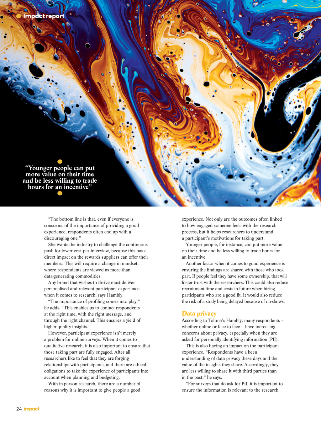 Impact report Younger people can put more value on their time and be less willing to trade hours for an incentive The bottom line is that, even if everyone is conscious of the importance of providing a good experience, respondents often end up with a discouraging one. She wants the industry to challenge the continuous push for lower cost per interview, because this has a direct impact on the rewards suppliers can offer their members. This will require a change in mindset, where respondents are viewed as more than data-generating commodities. Any brand that wishes to thrive must deliver personalised and relevant participant experience when it comes to research, says Hambly. The importance of profiling comes into play, he adds. This enables us to contact respondents at the right time, with the right message, and through the right channel. This ensures a yield of higher-quality insights. However, participant experience isnt merely a problem for online surveys. When it comes to qualitative research, it is also important to ensure that those taking part are fully engaged. After all, researchers like to feel that they are forging relationships with participants, and there are ethical obligations to take the experience of participants into account when planning and budgeting. With in-person research, there are a number of reasons why it is important to give people a good experience. Not only are the outcomes often linked to how engaged someone feels with the research process, but it helps researchers to understand a participants motivations for taking part. Younger people, for instance, can put more value on their time and be less willing to trade hours for an incentive. Another factor when it comes to good experience is ensuring the findings are shared with those who took part. If people feel they have some ownership, that will foster trust with the researchers. This could also reduce recruitment time and costs in future when hiring participants who are a good fit. It would also reduce the risk of a study being delayed because of no-shows. Data privacy According to Tolunas Hambly, many respondents whether online or face to face have increasing concerns about privacy, especially when they are asked for personally identifying information (PII). This is also having an impact on the participant experience. Respondents have a keen understanding of data privacy these days and the value of the insights they share. Accordingly, they are less willing to share it with third parties than in the past, he says. For surveys that do ask for PII, it is important to ensure the information is relevant to the research. 24 Impact ISSUE 36 2022_pp18-27_Report.indd 24 08/12/2021 10:00