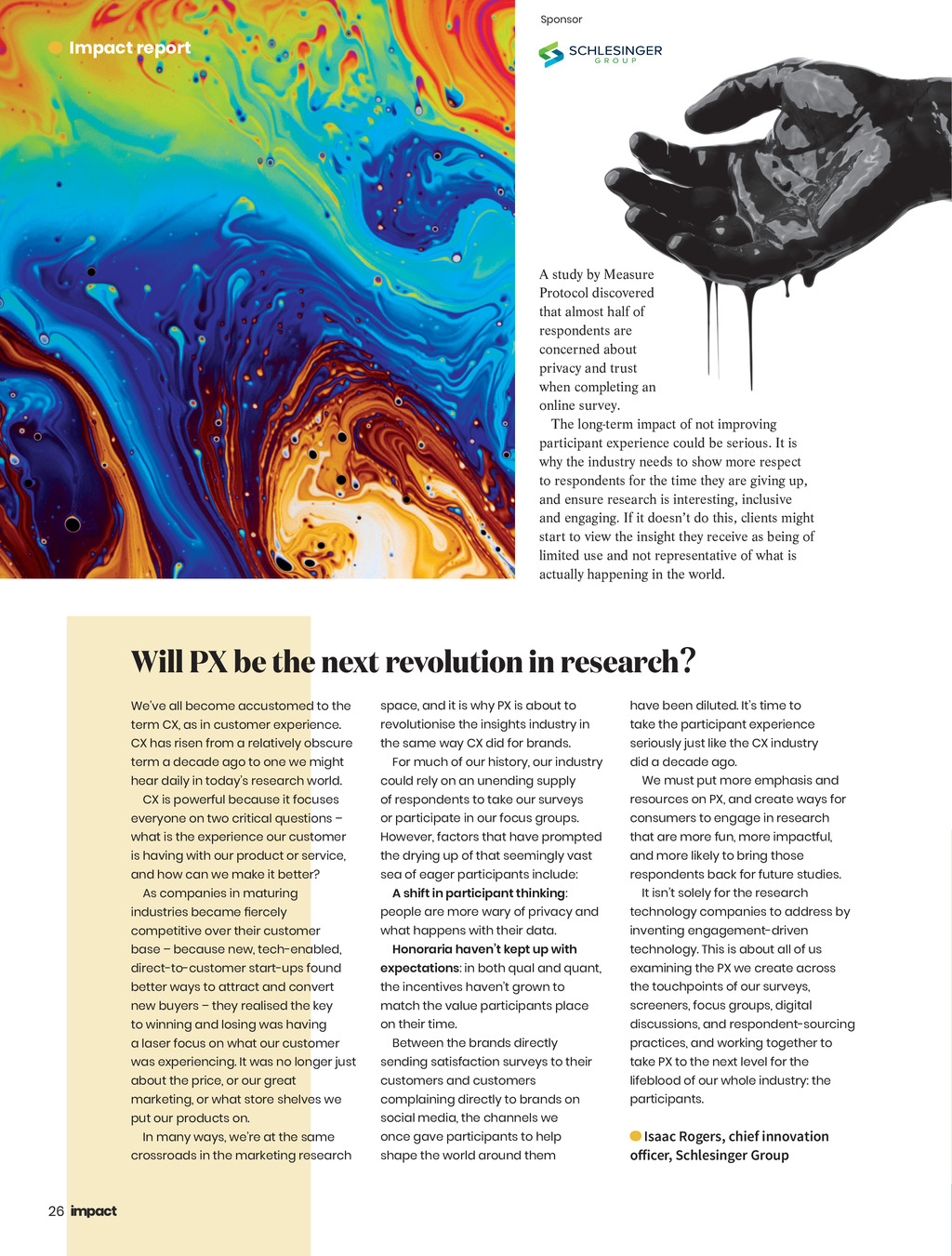 Sponsor Impact report A study by Measure Protocol discovered that almost half of respondents are concerned about privacy and trust when completing an online survey. The long-term impact of not improving participant experience could be serious. It is why the industry needs to show more respect to respondents for the time they are giving up, and ensure research is interesting, inclusive and engaging. If it doesnt do this, clients might start to view the insight they receive as being of limited use and not representative of what is actually happening in the world. Will PX be the next revolution in research? Weve all become accustomed to the space, and it is why PX is about to have been diluted. Its time to term CX, as in customer experience. revolutionise the insights industry in take the participant experience CX has risen from a relatively obscure the same way CX did for brands. seriously just like the CX industry term a decade ago to one we might hear daily in todays research world. For much of our history, our industry could rely on an unending supply did a decade ago. We must put more emphasis and of respondents to take our surveys resources on PX, and create ways for everyone on two critical questions or participate in our focus groups. consumers to engage in research what is the experience our customer However, factors that have prompted that are more fun, more impactful, is having with our product or service, the drying up of that seemingly vast and more likely to bring those and how can we make it better? sea of eager participants include: respondents back for future studies. CX is powerful because it focuses As companies in maturing A shift in participant thinking: It isnt solely for the research industries became fiercely people are more wary of privacy and technology companies to address by competitive over their customer what happens with their data. inventing engagement-driven base because new, tech-enabled, Honoraria havent kept up with technology. This is about all of us direct-to-customer start-ups found expectations: in both qual and quant, examining the PX we create across better ways to attract and convert the incentives havent grown to the touchpoints of our surveys, new buyers they realised the key match the value participants place screeners, focus groups, digital to winning and losing was having on their time. discussions, and respondent-sourcing a laser focus on what our customer Between the brands directly practices, and working together to was experiencing. It was no longer just sending satisfaction surveys to their take PX to the next level for the about the price, or our great customers and customers lifeblood of our whole industry: the marketing, or what store shelves we complaining directly to brands on participants. put our products on. social media, the channels we In many ways, were at the same once gave participants to help crossroads in the marketing research shape the world around them Isaac Rogers, chief innovation officer, Schlesinger Group 26 Impact ISSUE 36 2022_pp18-27_Report.indd 26 08/12/2021 10:00