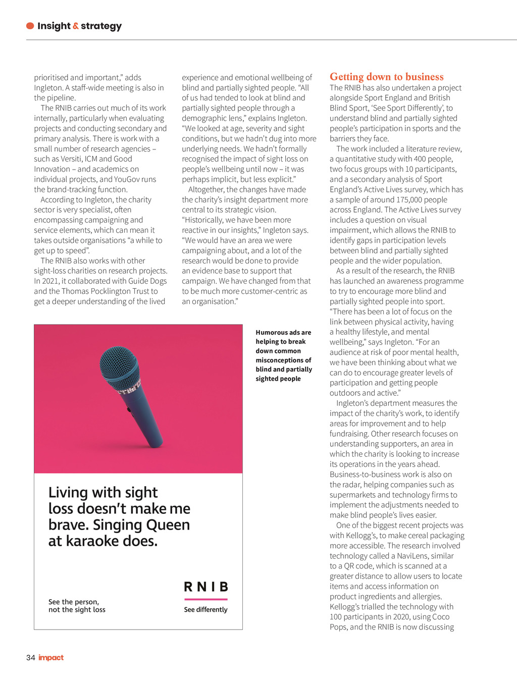 Insight & strategy prioritised and important, adds Ingleton. A staff-wide meeting is also in the pipeline. The RNIB carries out much of its work internally, particularly when evaluating projects and conducting secondary and primary analysis. There is work with a small number of research agencies such as Versiti, ICM and Good Innovation and academics on individual projects, and YouGov runs the brand-tracking function. According to Ingleton, the charity sector is very specialist, often encompassing campaigning and service elements, which can mean it takes outside organisations a while to get up to speed. The RNIB also works with other sight-loss charities on research projects. In 2021, it collaborated with Guide Dogs and the Thomas Pocklington Trust to get a deeper understanding of the lived experience and emotional wellbeing of blind and partially sighted people. All of us had tended to look at blind and partially sighted people through a demographic lens, explains Ingleton. We looked at age, severity and sight conditions, but we hadnt dug into more underlying needs. We hadnt formally recognised the impact of sight loss on peoples wellbeing until now it was perhaps implicit, but less explicit. Altogether, the changes have made the charitys insight department more central to its strategic vision. Historically, we have been more reactive in our insights, Ingleton says. We would have an area we were campaigning about, and a lot of the research would be done to provide an evidence base to support that campaign. We have changed from that to be much more customer-centric as an organisation. Humorous ads are helping to break down common misconceptions of blind and partially sighted people Getting down to business The RNIB has also undertaken a project alongside Sport England and British Blind Sport, See Sport Differently, to understand blind and partially sighted peoples participation in sports and the barriers they face. The work included a literature review, a quantitative study with 400 people, two focus groups with 10 participants, and a secondary analysis of Sport Englands Active Lives survey, which has a sample of around 175,000 people across England. The Active Lives survey includes a question on visual impairment, which allows the RNIB to identify gaps in participation levels between blind and partially sighted people and the wider population. As a result of the research, the RNIB has launched an awareness programme to try to encourage more blind and partially sighted people into sport. There has been a lot of focus on the link between physical activity, having a healthy lifestyle, and mental wellbeing, says Ingleton. For an audience at risk of poor mental health, we have been thinking about what we can do to encourage greater levels of participation and getting people outdoors and active. Ingletons department measures the impact of the charitys work, to identify areas for improvement and to help fundraising. Other research focuses on understanding supporters, an area in which the charity is looking to increase its operations in the years ahead. Business-to-business work is also on the radar, helping companies such as supermarkets and technology firms to implement the adjustments needed to make blind peoples lives easier. One of the biggest recent projects was with Kelloggs, to make cereal packaging more accessible. The research involved technology called a NaviLens, similar to a QR code, which is scanned at a greater distance to allow users to locate items and access information on product ingredients and allergies. Kelloggs trialled the technology with 100 participants in 2020, using Coco Pops, and the RNIB is now discussing 34 Impact ISSUE 36 2022_pp32-35 I&S RNIB.indd 34 08/12/2021 10:07