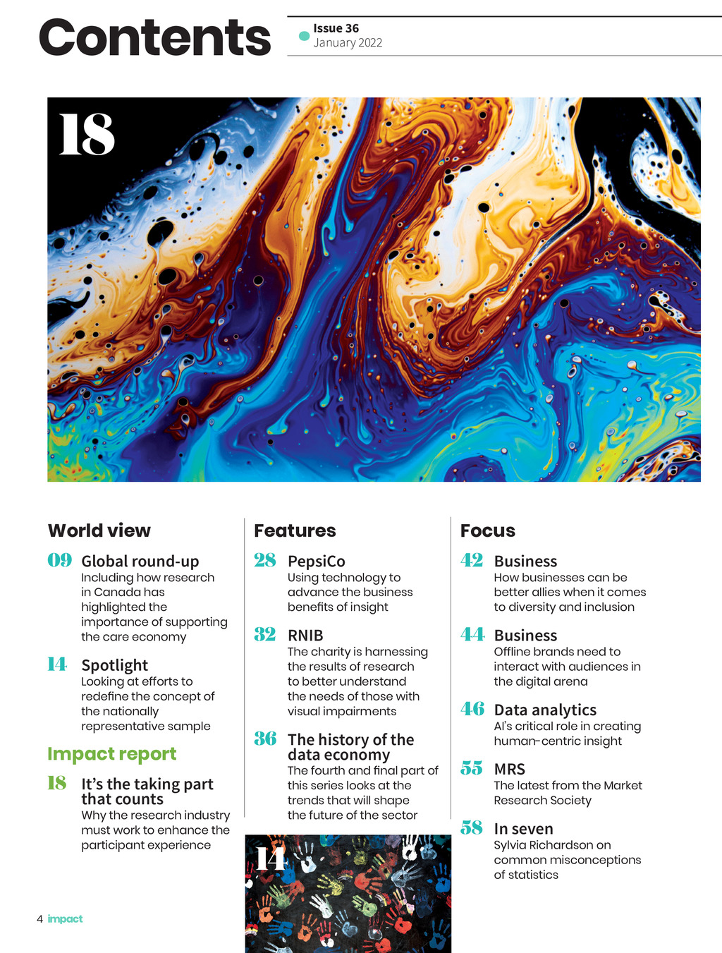 Contents Issue 36 January 2022 18 World view Features Focus 09 Global round-up 28 PepsiCo 42 Business 32 RNIB 44 Business Including how research in Canada has highlighted the importance of supporting the care economy 14 Spotlight Looking at efforts to redefine the concept of the nationally representative sample Impact report 18 Its the taking part that counts Why the research industry must work to enhance the participant experience Using technology to advance the business benefits of insight The charity is harnessing the results of research to better understand the needs of those with visual impairments 36 The history of the data economy The fourth and final part of this series looks at the trends that will shape the future of the sector 14 How businesses can be better allies when it comes to diversity and inclusion Offline brands need to interact with audiences in the digital arena 46 Data analytics AIs critical role in creating human-centric insight 55 MRS The latest from the Market Research Society 58 In seven Sylvia Richardson on common misconceptions of statistics 4 Impact ISSUE 36 2022_pp4-5_contents.indd 4 08/12/2021 09:28