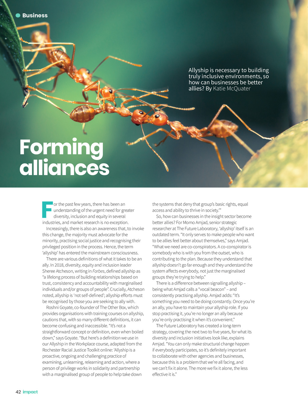 Business Allyship is necessary to building truly inclusive environments, so how can businesses be better allies? By Katie McQuater Forming alliances F or the past few years, there has been an understanding of the urgent need for greater diversity, inclusion and equity in several industries, and market research is no exception. Increasingly, there is also an awareness that, to invoke this change, the majority must advocate for the minority, practising social justice and recognising their privileged position in the process. Hence, the term allyship has entered the mainstream consciousness. There are various definitions of what it takes to be an ally. In 2018, diversity, equity and inclusion leader Sheree Atcheson, writing in Forbes, defined allyship as a lifelong process of building relationships based on trust, consistency and accountability with marginalised individuals and/or groups of people. Crucially, Atcheson noted, allyship is not self-defined; allyship efforts must be recognised by those you are seeking to ally with. Roshni Goyate, co-founder of The Other Box, which provides organisations with training courses on allyship, cautions that, with so many different definitions, it can become confusing and inaccessible. Its not a straightforward concept or definition, even when boiled down, says Goyate. But heres a definition we use in our Allyship in the Workplace course, adapted from the Rochester Racial Justice Toolkit online: Allyship is a proactive, ongoing and challenging practice of examining, unlearning, relearning and action, where a person of privilege works in solidarity and partnership with a marginalised group of people to help take down the systems that deny that groups basic rights, equal access and ability to thrive in society. So, how can businesses in the insight sector become better allies? For Momo Amjad, senior strategic researcher at The Future Laboratory, allyship itself is an outdated term. It only serves to make people who want to be allies feel better about themselves, says Amjad. What we need are co-conspirators. A co-conspirator is somebody who is with you from the outset, who is contributing to the plan. Because they understand that allyship doesnt go far enough and they understand the system affects everybody, not just the marginalised groups theyre trying to help. There is a difference between signalling allyship being what Amjad calls a vocal beacon and consistently practising allyship. Amjad adds: Its something you need to be doing constantly. Once youre an ally, you have to maintain your allyship role. If you stop practising it, youre no longer an ally because youre only practising it when its convenient. The Future Laboratory has created a long-term strategy, covering the next two to five years, for what its diversity and inclusion initiatives look like, explains Amjad. You can only make structural change happen if everybody participates, so its definitely important to collaborate with other agencies and businesses, because this is a problem that were all facing, and we cant fix it alone. The more we fix it alone, the less effective it is. 42 Impact ISSUE 36 2022_pp42-43 Business.indd 42 08/12/2021 10:12
