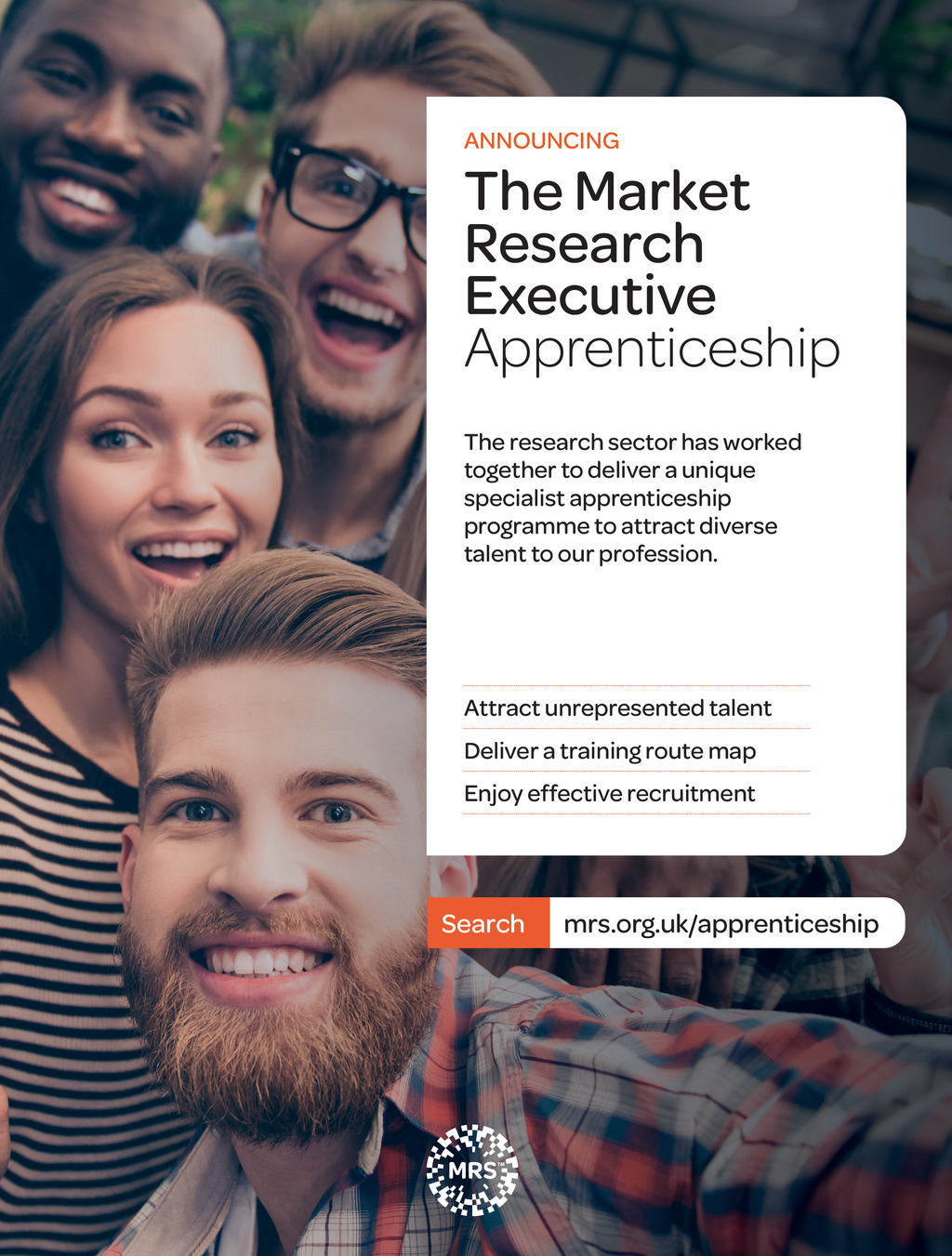 ANNOUNCING The Market Research Executive Apprenticeship The research sector has worked together to deliver a unique specialist apprenticeship programme to attract diverse talent to our profession. Attract unrepresented talent Deliver a training route map Enjoy effective recruitment Search Impact ISSUE 36 2022_pp54-57_MRS.indd 54 mrs.org.uk/apprenticeship 08/12/2021 10:22