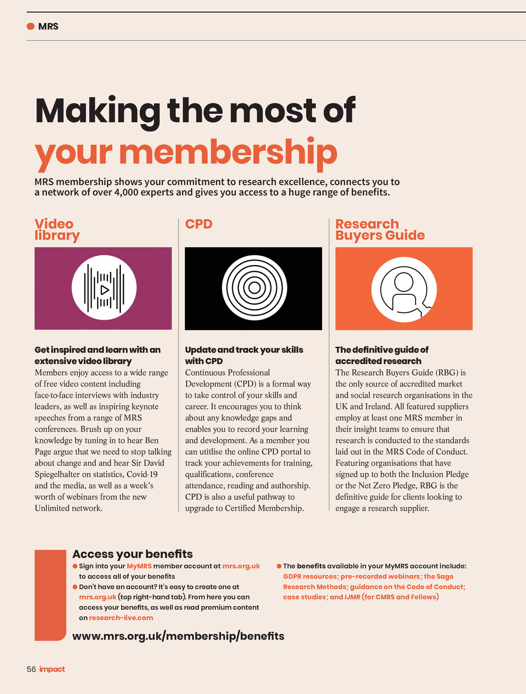 MRS Making the most of your membership MRS membership shows your commitment to research excellence, connects you to a network of over 4,000 experts and gives you access to a huge range of benefits. Video library CPD Research Buyers Guide Get inspired and learn with an extensive video library Update and track your skills with CPD The definitive guide of accredited research Members enjoy access to a wide range of free video content including face-to-face interviews with industry leaders, as well as inspiring keynote speeches from a range of MRS conferences. Brush up on your knowledge by tuning in to hear Ben Page argue that we need to stop talking about change and and hear Sir David Spiegelhalter on statistics, Covid-19 and the media, as well as a weeks worth of webinars from the new Unlimited network. Continuous Professional Development (CPD) is a formal way to take control of your skills and career. It encourages you to think about any knowledge gaps and enables you to record your learning and development. As a member you can utitlise the online CPD portal to track your achievements for training, qualifications, conference attendance, reading and authorship. CPD is also a useful pathway to upgrade to Certified Membership. The Research Buyers Guide (RBG) is the only source of accredited market and social research organisations in the UK and Ireland. All featured suppliers employ at least one MRS member in their insight teams to ensure that research is conducted to the standards laid out in the MRS Code of Conduct. Featuring organisations that have signed up to both the Inclusion Pledge or the Net Zero Pledge, RBG is the definitive guide for clients looking to engage a research supplier. Access your benefits Sign into your MyMRS member account at mrs.org.uk to access all of your benefits Dont have an account? Its easy to create one at mrs.org.uk (top right-hand tab). From here you can The benefits available in your MyMRS account include: GDPR resources; pre-recorded webinars; the Sage Research Methods; guidance on the Code of Conduct; case studies; and IJMR (for CMRS and Fellows) access your benefits, as well as read premium content on research-live.com www.mrs.org.uk/membership/benefits 56 Impact ISSUE 36 2022_pp54-57_MRS.indd 56 08/12/2021 10:22