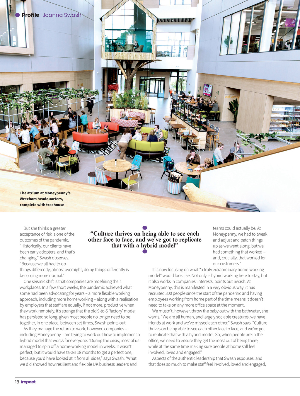 Profile Joanna Swash The atrium at Moneypennys Wrexham headquarters, complete with treehouse teams could actually be. At But she thinks a greater Moneypenny, we had to tweak acceptance of risk is one of the Culture thrives on being able to see each and adjust and patch things outcomes of the pandemic. other face to face, and weve got to replicate up as we went along, but we Historically, our clients have that with a hybrid model had something that worked been early adopters, and thats and, crucially, that worked for changing, Swash observes. our customers. Because we all had to do It is now focusing on what a truly extraordinary home-working things differently, almost overnight, doing things differently is model would look like. Not only is hybrid working here to stay, but becoming more normal. it also works in companies interests, points out Swash. At One seismic shift is that companies are redefining their Moneypenny, this is manifested in a very obvious way: it has workplaces. In a few short weeks, the pandemic achieved what recruited 300 people since the start of the pandemic and having some had been advocating for years a more flexible working employees working from home part of the time means it doesnt approach, including more home working along with a realisation need to take on any more office space at the moment. by employers that staff are equally, if not more, productive when We mustnt, however, throw the baby out with the bathwater, she they work remotely. Its strange that the old 9-to-5 factory model warns. We are all human, and largely sociable creatures; we have has persisted so long, given most people no longer need to be friends at work and weve missed each other, Swash says. Culture together, in one place, between set times, Swash points out. thrives on being able to see each other face to face, and weve got As they manage the return to work, however, companies to replicate that with a hybrid model. So, when people are in the including Moneypenny are trying to work out how to implement a office, we need to ensure they get the most out of being there, hybrid model that works for everyone. During the crisis, most of us while at the same time making sure people at home still feel managed to spin off a home-working model in weeks. It wasnt involved, loved and engaged. perfect, but it would have taken 18 months to get a perfect one, Aspects of the authentic leadership that Swash espouses, and because youd have looked at it from all sides, says Swash. What that does so much to make staff feel involved, loved and engaged, we did showed how resilient and flexible UK business leaders and 18 Impact ISSUE 37 2022_pp16-19_Profile.indd 18 28/03/2022 14:46
