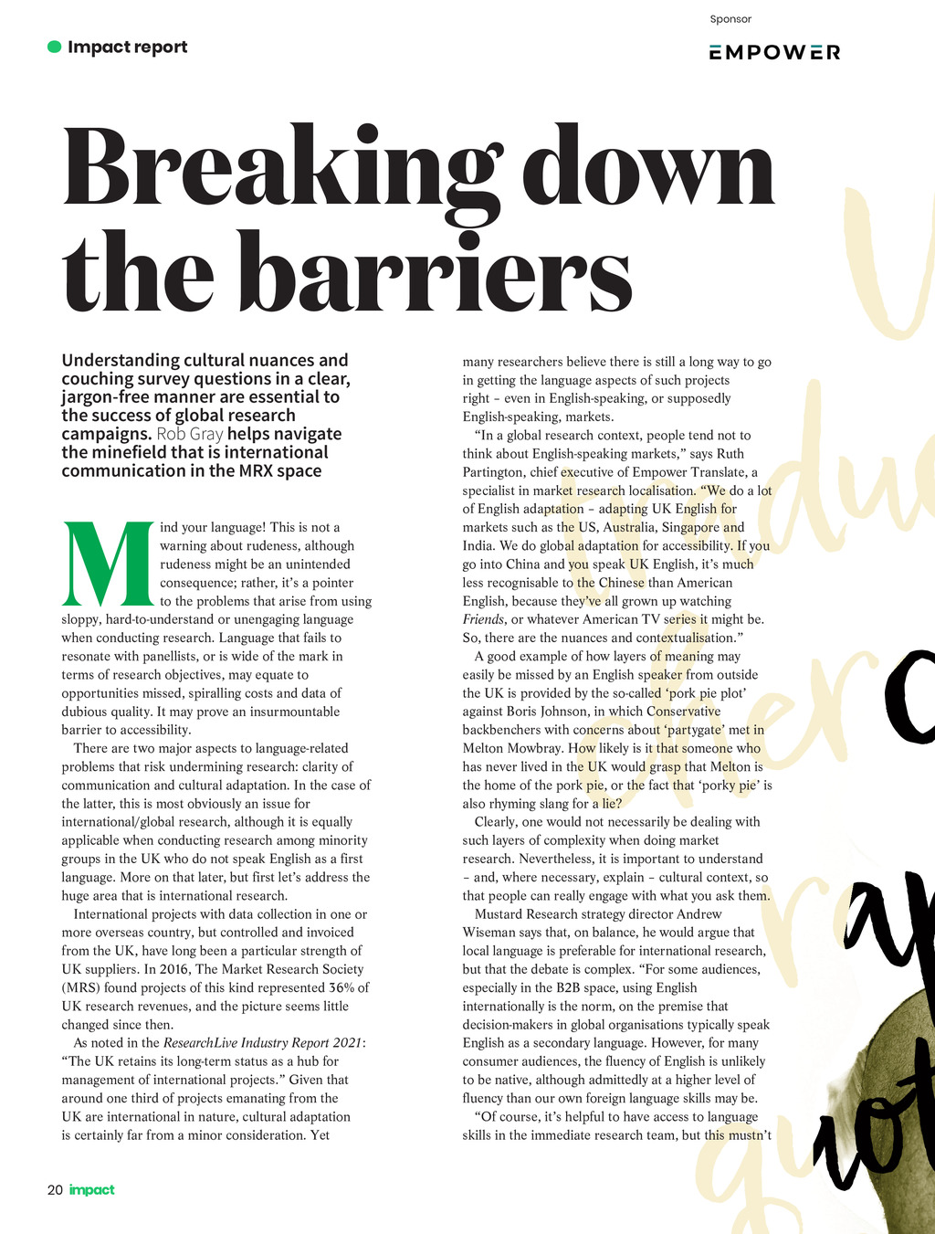 Sponsor Impact report Breaking down the barriers Understanding cultural nuances and couching survey questions in a clear, jargon-free manner are essential to the success of global research campaigns. Rob Gray helps navigate the minefield that is international communication in the MRX space M ind your language! This is not a warning about rudeness, although rudeness might be an unintended consequence; rather, its a pointer to the problems that arise from using sloppy, hard-to-understand or unengaging language when conducting research. Language that fails to resonate with panellists, or is wide of the mark in terms of research objectives, may equate to opportunities missed, spiralling costs and data of dubious quality. It may prove an insurmountable barrier to accessibility. There are two major aspects to language-related problems that risk undermining research: clarity of communication and cultural adaptation. In the case of the latter, this is most obviously an issue for international/global research, although it is equally applicable when conducting research among minority groups in the UK who do not speak English as a first language. More on that later, but first lets address the huge area that is international research. International projects with data collection in one or more overseas country, but controlled and invoiced from the UK, have long been a particular strength of UK suppliers. In 2016, The Market Research Society (MRS) found projects of this kind represented 36% of UK research revenues, and the picture seems little changed since then. As noted in the ResearchLive Industry Report 2021: The UK retains its long-term status as a hub for management of international projects. Given that around one third of projects emanating from the UK are international in nature, cultural adaptation is certainly far from a minor consideration. Yet many researchers believe there is still a long way to go in getting the language aspects of such projects right even in English-speaking, or supposedly English-speaking, markets. In a global research context, people tend not to think about English-speaking markets, says Ruth Partington, chief executive of Empower Translate, a specialist in market research localisation. We do a lot of English adaptation adapting UK English for markets such as the US, Australia, Singapore and India. We do global adaptation for accessibility. If you go into China and you speak UK English, its much less recognisable to the Chinese than American English, because theyve all grown up watching Friends, or whatever American TV series it might be. So, there are the nuances and contextualisation. A good example of how layers of meaning may easily be missed by an English speaker from outside the UK is provided by the so-called pork pie plot against Boris Johnson, in which Conservative backbenchers with concerns about partygate met in Melton Mowbray. How likely is it that someone who has never lived in the UK would grasp that Melton is the home of the pork pie, or the fact that porky pie is also rhyming slang for a lie? Clearly, one would not necessarily be dealing with such layers of complexity when doing market research. Nevertheless, it is important to understand and, where necessary, explain cultural context, so that people can really engage with what you ask them. Mustard Research strategy director Andrew Wiseman says that, on balance, he would argue that local language is preferable for international research, but that the debate is complex. For some audiences, especially in the B2B space, using English internationally is the norm, on the premise that decision-makers in global organisations typically speak English as a secondary language. However, for many consumer audiences, the fluency of English is unlikely to be native, although admittedly at a higher level of fluency than our own foreign language skills may be. Of course, its helpful to have access to language skills in the immediate research team, but this mustnt 20 Impact ISSUE 37 2022_pp20-29_Report.indd 20 30/03/2022 12:29
