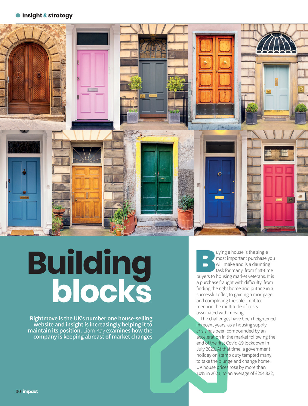 Insight & strategy Building blocks Rightmove is the UKs number one house-selling website and insight is increasingly helping it to maintain its position. Liam Kay examines how the company is keeping abreast of market changes B uying a house is the single most important purchase you will make and is a daunting task for many, from first-time buyers to housing market veterans. It is a purchase fraught with difficulty, from finding the right home and putting in a successful offer, to gaining a mortgage and completing the sale not to mention the multitude of costs associated with moving. The challenges have been heightened in recent years, as a housing supply crisis has been compounded by an acceleration in the market following the end of the first Covid-19 lockdown in July 2020. At that time, a government holiday on stamp duty tempted many to take the plunge and change home. UK house prices rose by more than 10% in 2021, to an average of 254,822, 30 Impact ISSUE 37 2022_pp30-33 I&S Rightmove.indd 30 30/03/2022 12:31