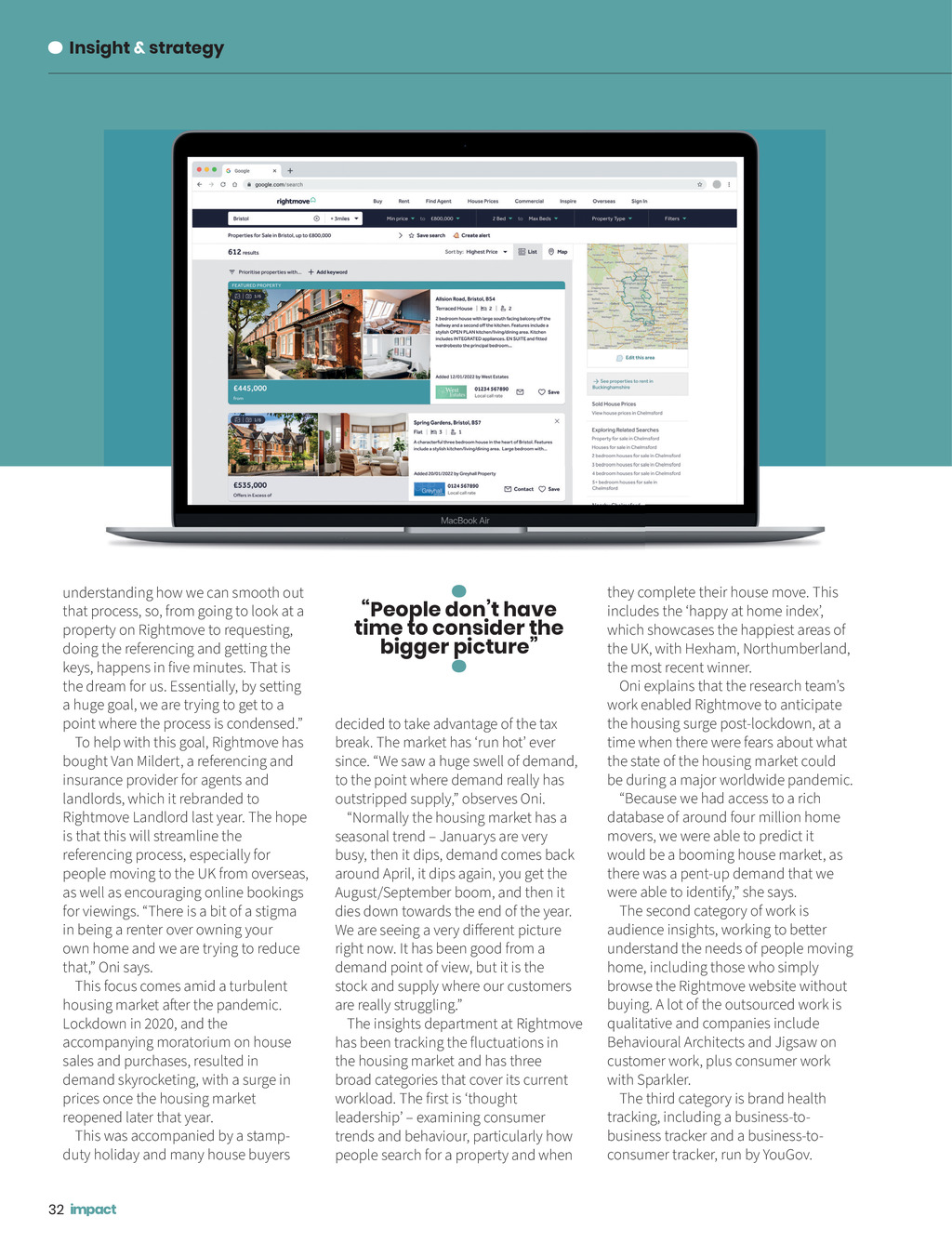 Insight & strategy understanding how we can smooth out that process, so, from going to look at a property on Rightmove to requesting, doing the referencing and getting the keys, happens in five minutes. That is the dream for us. Essentially, by setting a huge goal, we are trying to get to a point where the process is condensed. To help with this goal, Rightmove has bought Van Mildert, a referencing and insurance provider for agents and landlords, which it rebranded to Rightmove Landlord last year. The hope is that this will streamline the referencing process, especially for people moving to the UK from overseas, as well as encouraging online bookings for viewings. There is a bit of a stigma in being a renter over owning your own home and we are trying to reduce that, Oni says. This focus comes amid a turbulent housing market after the pandemic. Lockdown in 2020, and the accompanying moratorium on house sales and purchases, resulted in demand skyrocketing, with a surge in prices once the housing market reopened later that year. This was accompanied by a stampduty holiday and many house buyers People dont have time to consider the bigger picture decided to take advantage of the tax break. The market has run hot ever since. We saw a huge swell of demand, to the point where demand really has outstripped supply, observes Oni. Normally the housing market has a seasonal trend Januarys are very busy, then it dips, demand comes back around April, it dips again, you get the August/September boom, and then it dies down towards the end of the year. We are seeing a very different picture right now. It has been good from a demand point of view, but it is the stock and supply where our customers are really struggling. The insights department at Rightmove has been tracking the fluctuations in the housing market and has three broad categories that cover its current workload. The first is thought leadership examining consumer trends and behaviour, particularly how people search for a property and when they complete their house move. This includes the happy at home index, which showcases the happiest areas of the UK, with Hexham, Northumberland, the most recent winner. Oni explains that the research teams work enabled Rightmove to anticipate the housing surge post-lockdown, at a time when there were fears about what the state of the housing market could be during a major worldwide pandemic. Because we had access to a rich database of around four million home movers, we were able to predict it would be a booming house market, as there was a pent-up demand that we were able to identify, she says. The second category of work is audience insights, working to better understand the needs of people moving home, including those who simply browse the Rightmove website without buying. A lot of the outsourced work is qualitative and companies include Behavioural Architects and Jigsaw on customer work, plus consumer work with Sparkler. The third category is brand health tracking, including a business-tobusiness tracker and a business-toconsumer tracker, run by YouGov. 32 Impact ISSUE 37 2022_pp30-33 I&S Rightmove.indd 32 28/03/2022 14:59