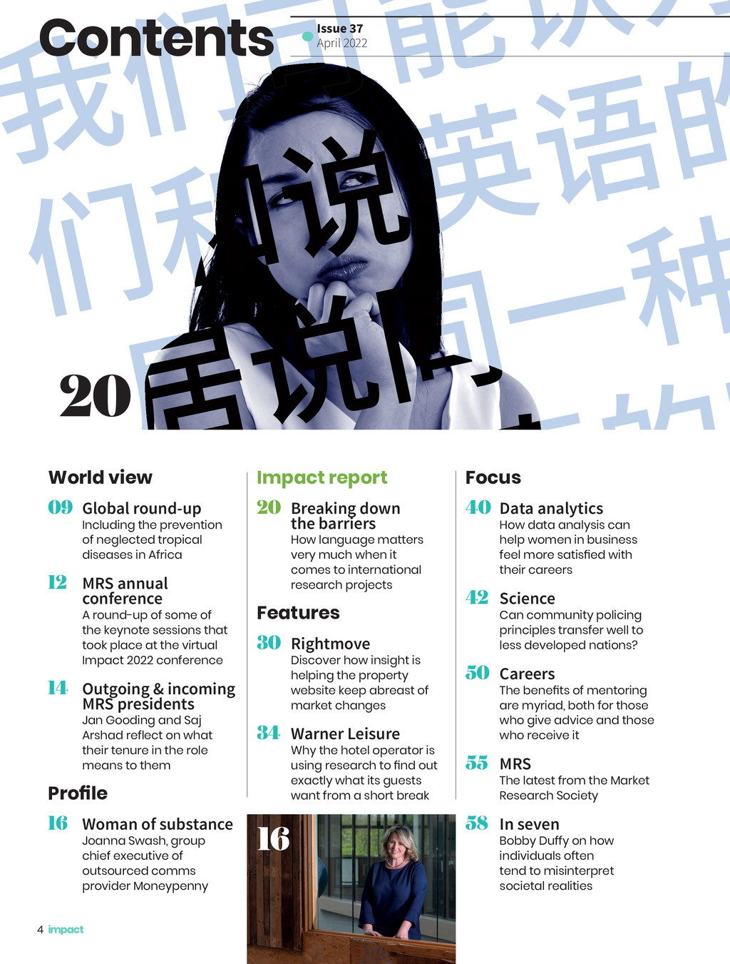 Contents Issue 37 April 2022 20 World view Impact report Focus 09 Global round-up 20 Breaking down 40 Data analytics Including the prevention of neglected tropical diseases in Africa the barriers How language matters very much when it comes to international research projects 12 MRS annual conference A round-up of some of the keynote sessions that took place at the virtual Impact 2022 conference Features 30 Rightmove Discover how insight is helping the property website keep abreast of market changes 14 Outgoing & incoming MRS presidents Jan Gooding and Saj Arshad reflect on what their tenure in the role means to them 34 Warner Leisure Why the hotel operator is using research to find out exactly what its guests want from a short break Profile 16 Woman of substance Joanna Swash, group chief executive of outsourced comms provider Moneypenny 16 How data analysis can help women in business feel more satisfied with their careers 42 Science Can community policing principles transfer well to less developed nations? 50 Careers The benefits of mentoring are myriad, both for those who give advice and those who receive it 55 MRS The latest from the Market Research Society 58 In seven Bobby Duffy on how individuals often tend to misinterpret societal realities 4 Impact ISSUE 37 2022_pp4-5_contents.indd 4 30/03/2022 10:56