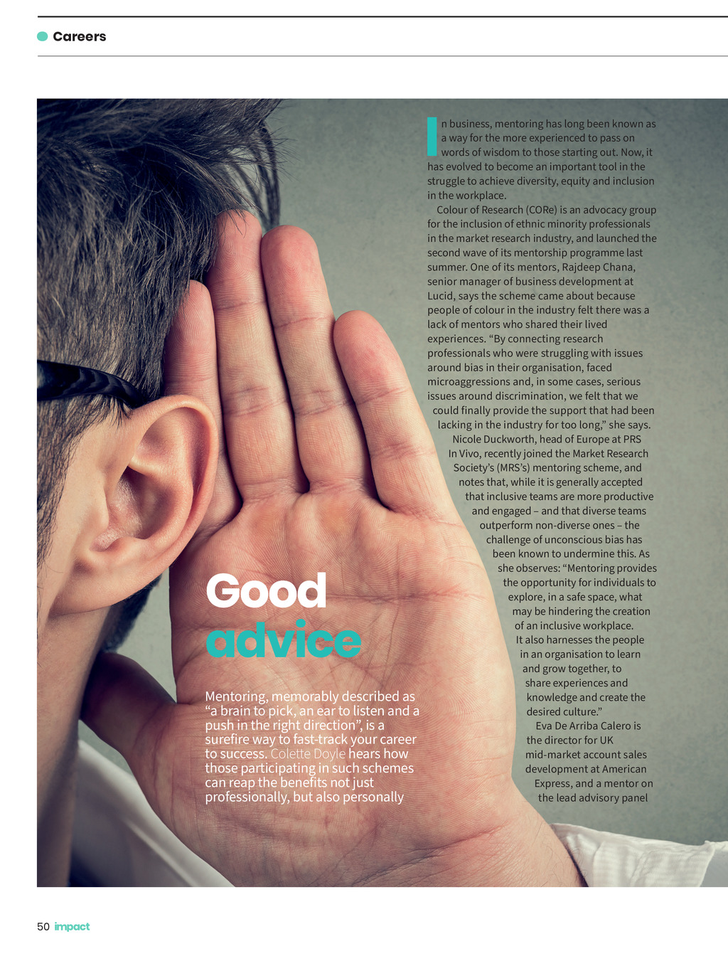 Careers I Good advice Mentoring, memorably described as a brain to pick, an ear to listen and a push in the right direction, is a surefire way to fast-track your career to success. Colette Doyle hears how those participating in such schemes can reap the benefits not just professionally, but also personally n business, mentoring has long been known as a way for the more experienced to pass on words of wisdom to those starting out. Now, it has evolved to become an important tool in the struggle to achieve diversity, equity and inclusion in the workplace. Colour of Research (CORe) is an advocacy group for the inclusion of ethnic minority professionals in the market research industry, and launched the second wave of its mentorship programme last summer. One of its mentors, Rajdeep Chana, senior manager of business development at Lucid, says the scheme came about because people of colour in the industry felt there was a lack of mentors who shared their lived experiences. By connecting research professionals who were struggling with issues around bias in their organisation, faced microaggressions and, in some cases, serious issues around discrimination, we felt that we could finally provide the support that had been lacking in the industry for too long, she says. Nicole Duckworth, head of Europe at PRS In Vivo, recently joined the Market Research Societys (MRSs) mentoring scheme, and notes that, while it is generally accepted that inclusive teams are more productive and engaged and that diverse teams outperform non-diverse ones the challenge of unconscious bias has been known to undermine this. As she observes: Mentoring provides the opportunity for individuals to explore, in a safe space, what may be hindering the creation of an inclusive workplace. It also harnesses the people in an organisation to learn and grow together, to share experiences and knowledge and create the desired culture. Eva De Arriba Calero is the director for UK mid-market account sales development at American Express, and a mentor on the lead advisory panel 50 Impact ISSUE 37 2022_pp50-51_Careers.indd 50 28/03/2022 15:36