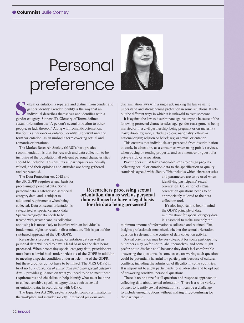 Columnist Julie Corney Personal preference S exual orientation is separate and distinct from gender and discrimination laws with a single act, making the law easier to gender identity. Gender identity is the way that an understand and strengthening protection in some situations. It sets individual describes themselves and identifies with a out the different ways in which it is unlawful to treat someone. gender category. Stonewalls Glossary of Terms defines It is against the law to discriminate against anyone because of the sexual orientation as: A persons sexual attraction to other following protected characteristics: age; gender reassignment; being people, or lack thereof. Along with romantic orientation, married or in a civil partnership; being pregnant or on maternity this forms a persons orientation identity. Stonewall uses the leave; disability; race, including colour, nationality, ethnic or term orientation as an umbrella term covering sexual and national origin; religion or belief; sex; or sexual orientation. romantic orientations. This ensures that individuals are protected from discrimination The Market Research Society (MRS)s best practice at work, in education, as a consumer, when using public services, recommendation is that, for research and data collection to be when buying or renting property, and as a member or guest of a inclusive of the population, all relevant personal characteristics private club or association. should be included. This ensures all participants are equally Practitioners must take reasonable steps to design projects valued, and their opinions and attitudes are being gathered collecting sexual orientation data to the specification or quality and represented. standards agreed with clients. This includes which characteristics The Data Protection Act 2018 and and parameters are to be used when the UK GDPR requires a legal basis for identifying participants sexual processing of personal data. Some orientation. Collection of sexual Researchers processing sexual personal data is categorised as special orientation questions needs to be orientation data as well as personal appropriately tailored to the data category data and is subject to data will need to have a legal basis collection tool. additional requirements when being for the data being processed collected. Data on sexual orientation is Its also important to bear in mind categorised as special category data. the GDPR principle of data Special category data needs to be minimisation: for special category data treated with greater care, as collecting it is essential to make sure only the and using it is more likely to interfere with an individuals minimum amount of information is collected and retained. Plus, fundamental rights or result in discrimination. This is part of the insights professionals must check whether the sexual orientation risk-based approach of the UK GDPR. question is relevant in the context of data collection activity. Researchers processing sexual orientation data as well as Sexual orientation may be very clear-cut for some participants, personal data will need to have a legal basis for the data being but others may prefer not to label themselves, and some might processed. When processing special category data, practitioners prefer not to disclose at all because they dont feel comfortable must have a lawful basis under article six of the GDPR in addition answering the questions. In some cases, answering such questions to meeting a special condition under article nine of the GDPR, could be potentially harmful for participants because of cultural but these grounds do not have to be linked. The MRS GDPR in conflicts, including the admission of illegality in some countries. brief no 10 Collection of ethnic data and other special category It is important to allow participants to self-describe and to opt out data provides guidance on what you need to do to meet these of answering sensitive, personal questions. requirements and checklists to help identify what must be done There is no one-size-fits-all question and response approach to to collect sensitive special category data, such as sexual collecting data about sexual orientation. There is a wide variety orientation data, in accordance with GDPR. of ways to identify sexual orientation, so it can be a challenge The Equalities Act 2010 protects people from discrimination in to include enough options without making it too confusing for the workplace and in wider society. It replaced previous antithe participant. 52 Impact ISSUE 37 2022_pp52-53 Legal.indd 52 28/03/2022 15:37