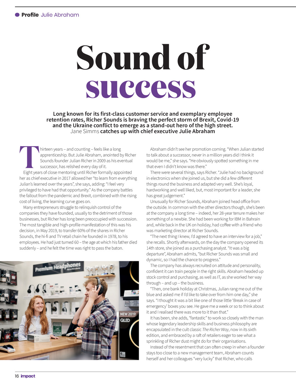 Profile Julie Abraham Sound of success Long known for its first-class customer service and exemplary employee retention rates, Richer Sounds is braving the perfect storm of Brexit, Covid-19 and the Ukraine conflict to emerge as a stand-out hero of the high street. Jane Simms catches up with chief executive Julie Abraham T hirteen years and counting feels like a long apprenticeship. But Julie Abraham, anointed by Richer Sounds founder Julian Richer in 2009 as his eventual successor, has relished every day of it. Eight years of close mentoring until Richer formally appointed her as chief executive in 2017 allowed her to learn from everything Julians learned over the years, she says, adding: I feel very privileged to have had that opportunity. As the company battles the fallout from the pandemic and Brexit, combined with the rising cost of living, the learning curve goes on. Many entrepreneurs struggle to relinquish control of the companies they have founded, usually to the detriment of those businesses, but Richer has long been preoccupied with succession. The most tangible and high-profile manifestation of this was his decision, in May 2019, to transfer 60% of the shares in Richer Sounds, the hi-fi and TV retail chain he founded in 1978, to his employees. He had just turned 60 the age at which his father died suddenly and he felt the time was right to pass the baton. Abraham didnt see her promotion coming. When Julian started to talk about a successor, never in a million years did I think it would be me, she says. He obviously spotted something in me that even I didnt know was there. There were several things, says Richer. Julie had no background in electronics when she joined us, but she did a few different things round the business and adapted very well. Shes loyal, hardworking and well liked, but, most important for a leader, she has great judgement. Unusually for Richer Sounds, Abraham joined head office from the outside. In common with the other directors though, shes been at the company a long time indeed, her 28-year tenure makes her something of a newbie. She had been working for IBM in Bahrain and, while back in the UK on holiday, had coffee with a friend who was marketing director at Richer Sounds. The next thing I knew, Id agreed to have an interview for a job, she recalls. Shortly afterwards, on the day the company opened its 14th store, she joined as a purchasing analyst. It was a big departure, Abraham admits, but Richer Sounds was small and dynamic, so I had the chance to progress. The company has always recruited on attitude and personality, confident it can train people in the right skills. Abraham headed up stock control and purchasing, as well as IT, as she worked her way through and up the business. Then, one bank holiday at Christmas, Julian rang me out of the blue and asked me if Id like to take over from him one day, she says. I thought it was a bit like one of those little Break in case of emergency boxes you see. He gave me a week or so to think about it and I realised there was more to it than that. It has been, she adds, fantastic to work so closely with the man whose legendary leadership skills and business philosophy are encapsulated in the cult classic The Richer Way, now in its sixth edition, and embraced by a raft of retailers eager to see what a sprinkling of Richer dust might do for their organisations. Instead of the resentment that can often creep in when a founder stays too close to a new management team, Abraham counts herself and her colleagues very lucky that Richer, who calls 16 Impact ISSUE 38 2022_pp16-19_Profile.indd 16 22/06/2022 14:52