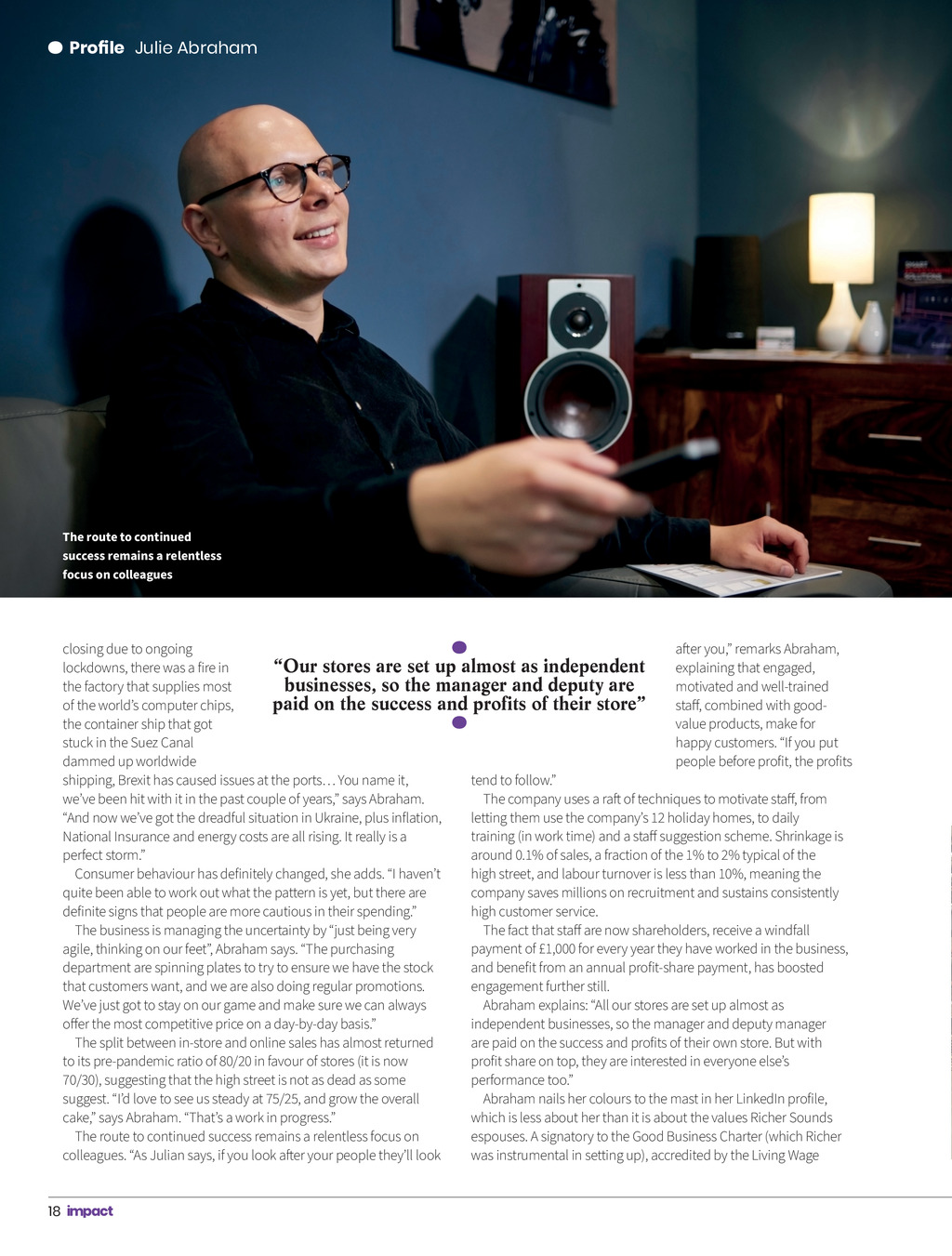 Profile Julie Abraham The route to continued success remains a relentless focus on colleagues after you, remarks Abraham, closing due to ongoing lockdowns, there was a fire in Our stores are set up almost as independent explaining that engaged, motivated and well-trained the factory that supplies most businesses, so the manager and deputy are of the worlds computer chips, paid on the success and profits of their store staff, combined with goodvalue products, make for the container ship that got happy customers. If you put stuck in the Suez Canal people before profit, the profits dammed up worldwide tend to follow. shipping, Brexit has caused issues at the ports You name it, The company uses a raft of techniques to motivate staff, from weve been hit with it in the past couple of years, says Abraham. letting them use the companys 12 holiday homes, to daily And now weve got the dreadful situation in Ukraine, plus inflation, training (in work time) and a staff suggestion scheme. Shrinkage is National Insurance and energy costs are all rising. It really is a around 0.1% of sales, a fraction of the 1% to 2% typical of the perfect storm. high street, and labour turnover is less than 10%, meaning the Consumer behaviour has definitely changed, she adds. I havent company saves millions on recruitment and sustains consistently quite been able to work out what the pattern is yet, but there are high customer service. definite signs that people are more cautious in their spending. The fact that staff are now shareholders, receive a windfall The business is managing the uncertainty by just being very payment of 1,000 for every year they have worked in the business, agile, thinking on our feet, Abraham says. The purchasing and benefit from an annual profit-share payment, has boosted department are spinning plates to try to ensure we have the stock engagement further still. that customers want, and we are also doing regular promotions. Abraham explains: All our stores are set up almost as Weve just got to stay on our game and make sure we can always independent businesses, so the manager and deputy manager offer the most competitive price on a day-by-day basis. are paid on the success and profits of their own store. But with The split between in-store and online sales has almost returned profit share on top, they are interested in everyone elses to its pre-pandemic ratio of 80/20 in favour of stores (it is now performance too. 70/30), suggesting that the high street is not as dead as some Abraham nails her colours to the mast in her LinkedIn profile, suggest. Id love to see us steady at 75/25, and grow the overall which is less about her than it is about the values Richer Sounds cake, says Abraham. Thats a work in progress. espouses. A signatory to the Good Business Charter (which Richer The route to continued success remains a relentless focus on was instrumental in setting up), accredited by the Living Wage colleagues. As Julian says, if you look after your people theyll look 18 Impact ISSUE 38 2022_pp16-19_Profile.indd 18 22/06/2022 14:52