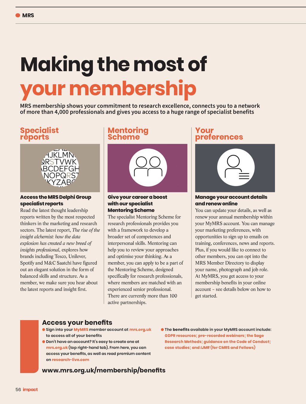 MRS Making the most of your membership MRS membership shows your commitment to research excellence, connects you to a network of more than 4,000 professionals and gives you access to a huge range of specialist benefits Specialist reports Mentoring Scheme Your preferences Access the MRS Delphi Group specialist reports Give your career a boost with our specialist Mentoring Scheme Manage your account details and renew online Read the latest thought leadership reports written by the most respected thinkers in the marketing and research sectors. The latest report, The rise of the insight alchemist: how the data explosion has created a new breed of insights professional, explores how brands including Tesco, Unilever, Spotify and M&C Saatchi have figured out an elegant solution in the form of balanced skills and structure. As a member, we make sure you hear about the latest reports and insight first. The specialist Mentoring Scheme for research professionals provides you with a framework to develop a broader set of competences and interpersonal skills. Mentoring can help you to review your approaches and optimise your thinking. As a member, you can apply to be a part of the Mentoring Scheme, designed specifically for research professionals, where members are matched with an experienced senior professional. There are currently more than 100 active partnerships. Access your benets Sign into your MyMRS member account at mrs.org.uk to access all of your benefits Dont have an account? Its easy to create one at mrs.org.uk (top right-hand tab). From here, you can You can update your details, as well as renew your annual membership within your MyMRS account. You can manage your marketing preferences, with opportunities to sign up to emails on training, conferences, news and reports. Plus, if you would like to connect to other members, you can opt into the MRS Member Directory to display your name, photograph and job role. At MyMRS, you get access to your membership benefits in your online account see details below on how to get started. The benefits available in your MyMRS account include: GDPR resources; pre-recorded webinars; the Sage Research Methods; guidance on the Code of Conduct; case studies; and IJMR (for CMRS and Fellows) access your benets, as well as read premium content on research-live.com www.mrs.org.uk/membership/benets 56 Impact ISSUE 38 2022_pp54-57_MRS.indd 56 22/06/2022 16:27